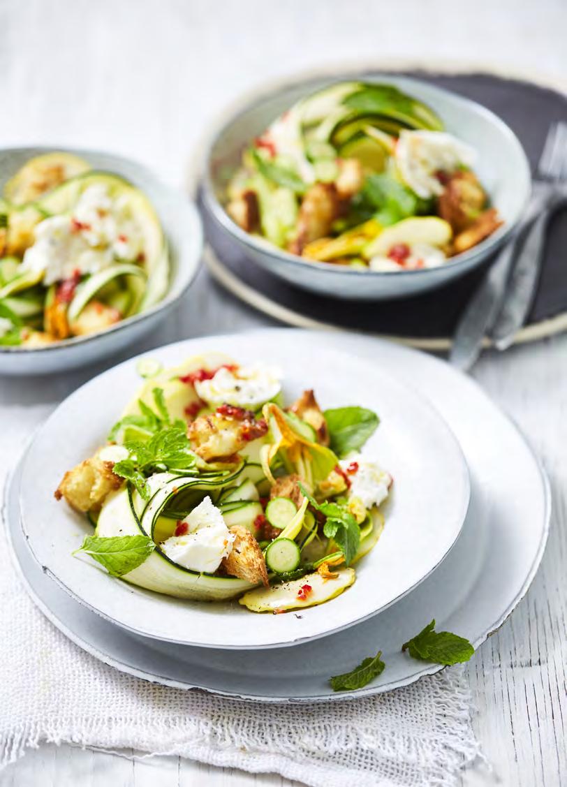 5 Combine zucchini, squash and torn flowers on a large platter; season and drizzle with half the chilli dressing. Top with croûtons, zucchini stems, torn mozzarella and mint; drizzle with remaining chilli dressing.