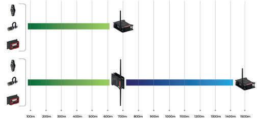 In case of problems in signal propagation, a repeater can be placed between the cell area and the gateway. The distances between the repeater(s) and the gateway depend on the environmental conditions (typically up to 700m in line-ofsight). Up to 5 repeaters can be managed by a single gateway.