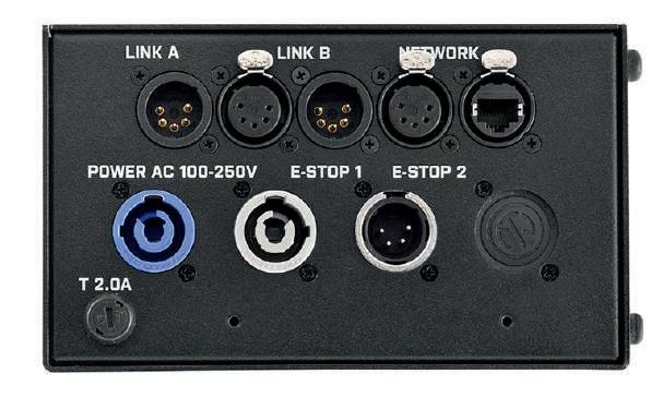FUSE T5A RELAY I / RELAY II Output Max 2A. 1 x Powercon connection external warning device CONTROLLER DATA 1x 5pin XLR. (IN-OUT) LIMIT STOP OUTPUT 2x 4pin XLR. Hardware E-Stop connection NETWORK Input from PC EXE Cell software LC-PRO INTERFACE 1-16 1x 7pin XLR-M and 1x 7pin XLR. Power to EXE Cell. LC-PRO INTERFACE 17-32 1x 7pin XLR-M and 1x 7pin XLR. Power to EXE Cell. THROUGH 1x Powercon. AC 100-230V 1x Powercon. WIRED back view front view