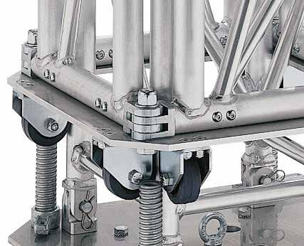 Base module for towers with frame of 29 cm sided square truss. The system comes furnished with detachable foldaway stabilizers. The multistandard sleeve block has 16 gliding wheels of high density rubber. Each foot moves both in pan and tilt so adapting to all terrain. The entire system, excluding the central truss, is formed of assembled parts, without any weldings.