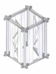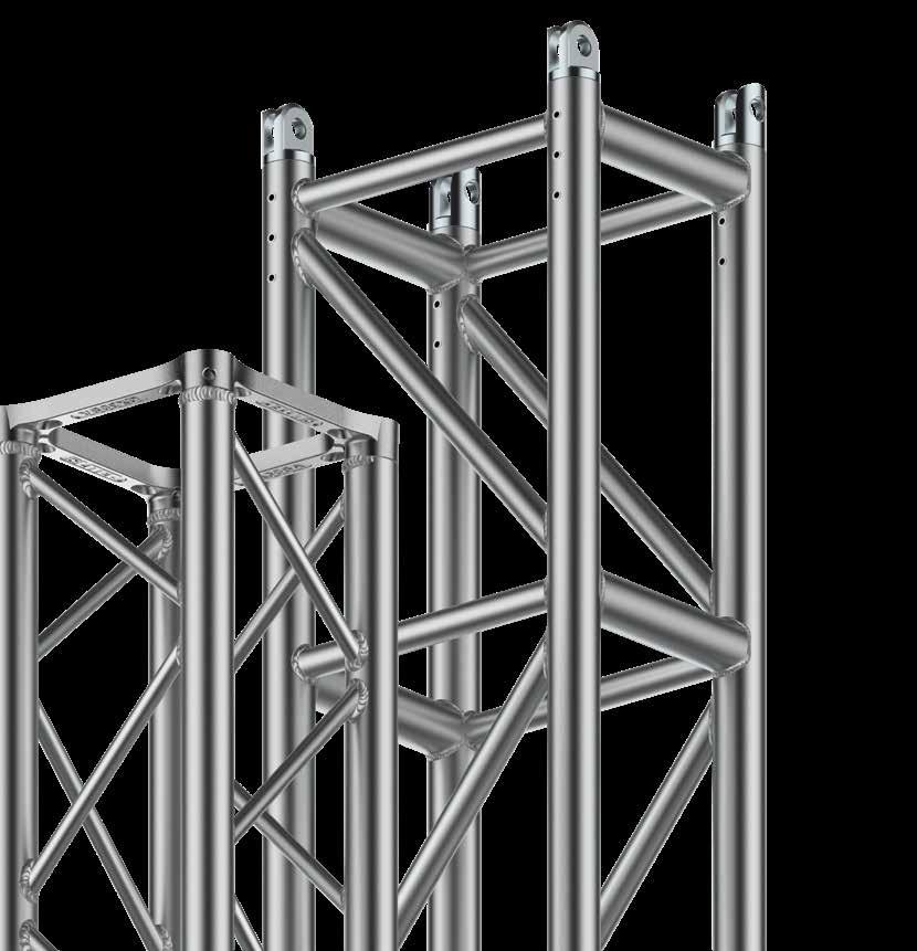 It is characterized by the introduction of Ø 48 x 3 mm chords and Ø 20 x 2 mm diagonals on all the faces. This truss constitutes Varitower 3–30 and Flyintower 9.5-600.