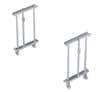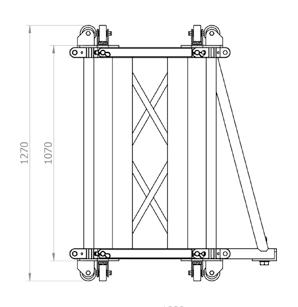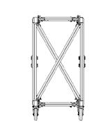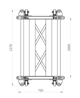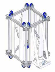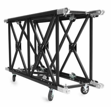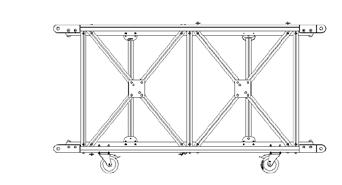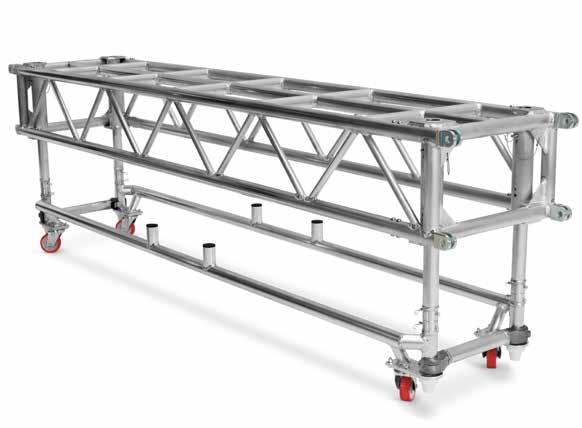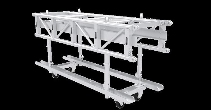 A pre-rig truss for supporting and transporting moving heads. It is equipped with 4 castor wheels for easy maneuverability and pins for the connection of truss pieces. Each truss is designed to carry a lighting bar complete with moving heads. The lighting bar is hooked onto the main chord and allows lights to move. This design reduces the amount of space required for rigging in the truck.