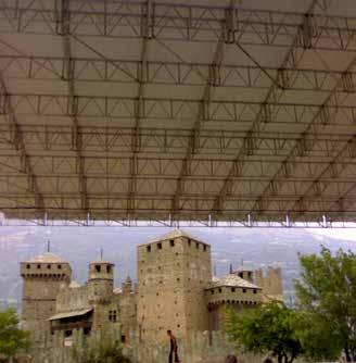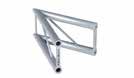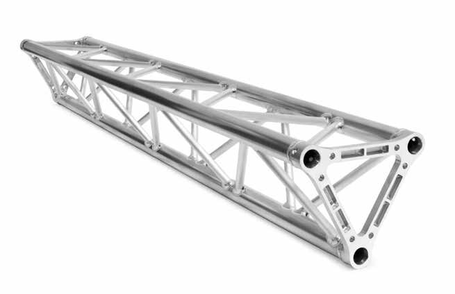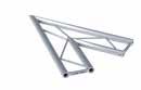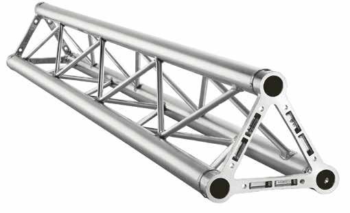 Triangular section aluminium truss with 25 cm long sides. This is the triangular version of the lightest professional structure, yet it is able to guarantee a reasonable loading capacity and span. The internal 14 mm diameter diagonal components are flush which decreases the aesthetic impact of this truss, which may therefore also be used in small areas.