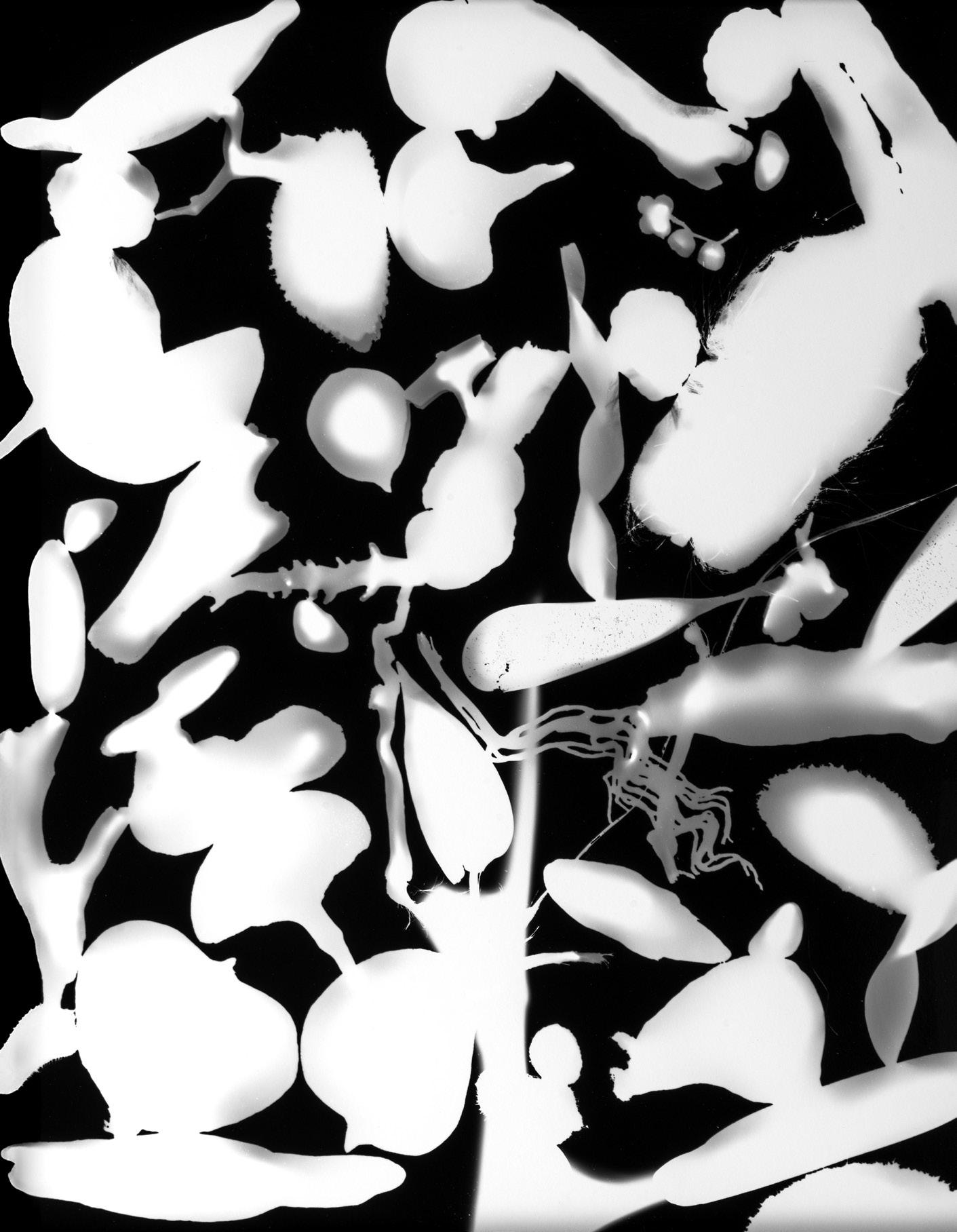 In monolux, we are immediately struck by the “memory of photography.” The series is composed of images taken without a camera, in a throwback to the photograms of William Talbot, the British pioneer who, in the first half of the nineteenth century, created images by direct contact. Placing leaves, feathers, or lace on chemically sensitized paper, he would them expose them to sunlight, creating a dark background and a white silhouette of the object. This technique was subsequently appropriated by vanguard artists in the twentieth century, when Man Ray named it the “rayograph.”