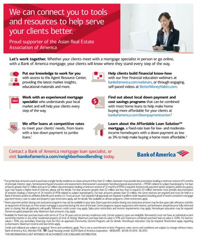 We can connect you to tools and resources to help serve your clients better. Proud supporter of the Asian Real Estate Association of America Let’s work together. Whether your clients meet with a mortgage specialist in person or go online, with a Bank of America mortgage, your clients will know where they stand every step of the way. Put our knowledge to work for you with access to the Agent Resource Center, providing the latest market insights, educational materials and more.