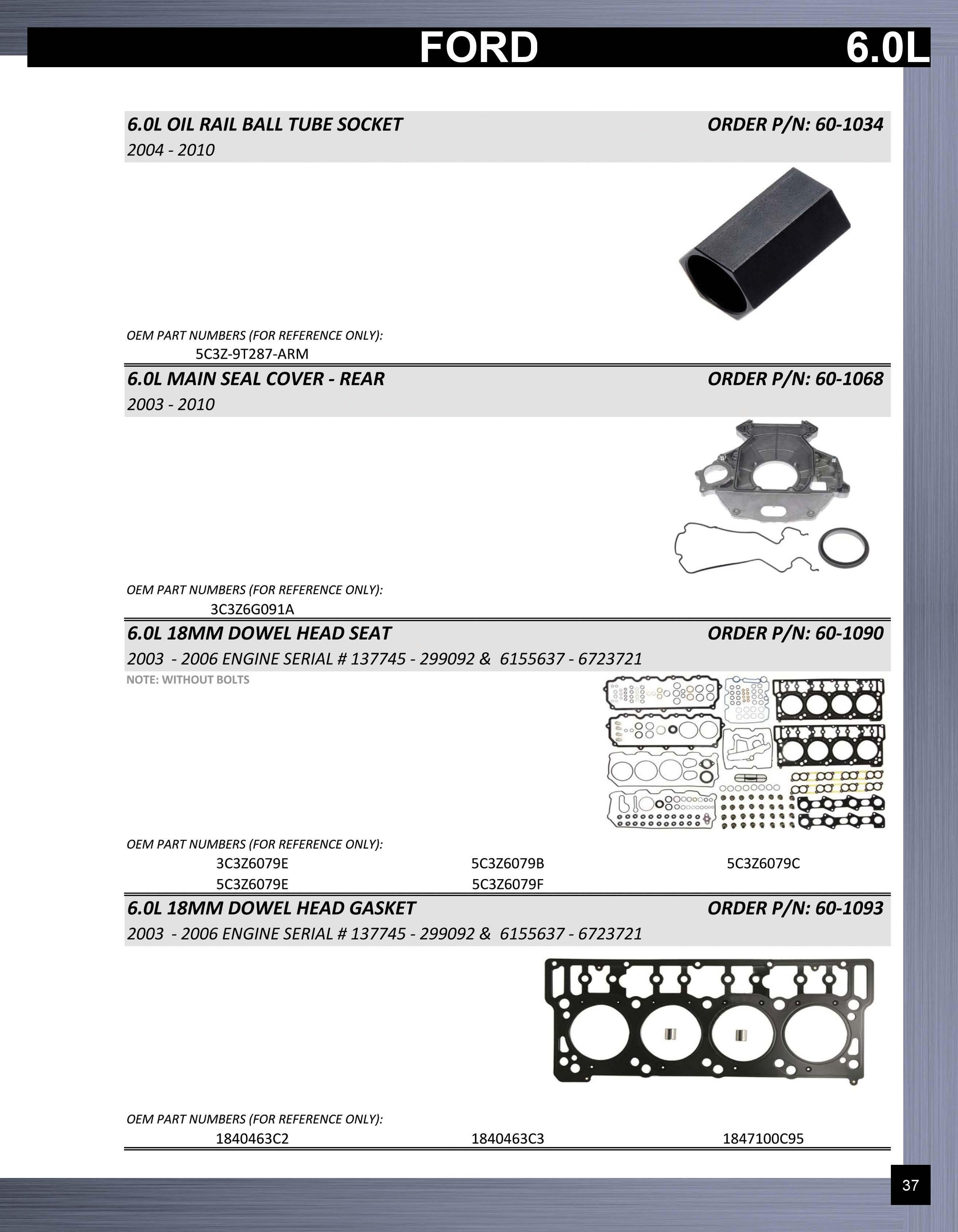 6.0L OIL RAIL BALL TUBE SOCKET 2004-2010 OEM PART NUMBERS (FOR REFERENCE ONL Y): SC3Z-9T287-ARM 6 . 0L MAIN SEAL COVER- REAR 2003-2010 OEM PART NUMBERS (FOR REFERENCE ONLY) : 3C3Z6G091A 6.0L 18MM DOWEL HEAD SEAT 2003 2006 ENGINE SERIAL# 137745- 299092 & 6155637- 6723721 NOTE: WITHOUT BOLTS OEM PART NUMBERS (FOR REFERENCE ONLY) : 3C3Z6079E SC3Z6079E 6.0L 18MM DOWEL HEAD GASKET SC3Z6079B SC3Z6079F 2003 2006 ENGINE SERIAL# 137745- 299092 & 6155637- 6723721 OEM PART NUMBERS (FOR REFERENCE ONLY) : 1840463(2 1840463(3 ORDER P/N: 60-1034 ORDER P/N: 60-1068 ORDER P/N: 60-1090 SC3Z6079C ORDER P/N: 60-1093 1847100(95