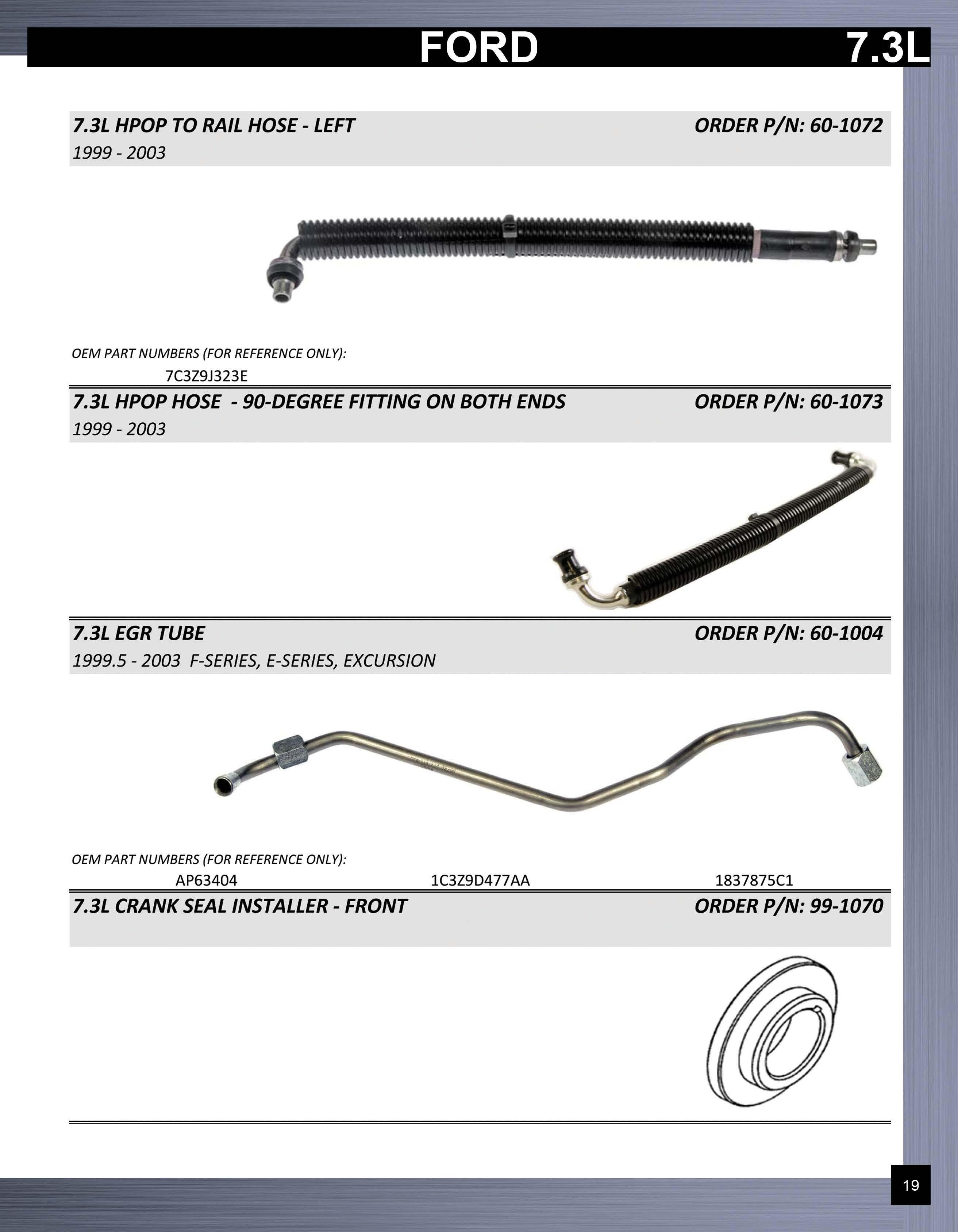 7.3L HPOP TO RAIL HOSE- LEFT 1999-2003 OEM PART NUMBERS (FOR REFERENCE ONLY) : 7C3Z9J323E 7.3L HPOP HOSE - 90-DEGREE FITTING ON BOTH ENDS 1999-2003 7.3L EGR TUBE 1999.5-2003 F-SERIES, E-SER/ES, EXCURSION OEM PART NUMBERS {FOR REFERENCE ONLY) : AP63404 1C3Z9D477AA 7.3L CRANK SEAL INSTALLER- FRONT ORDER P/N: 60-1072 ORDER P/N: 60-1073 ORDER P/N: 60-1004 1837875C1 ORDER P/N: 99-1070