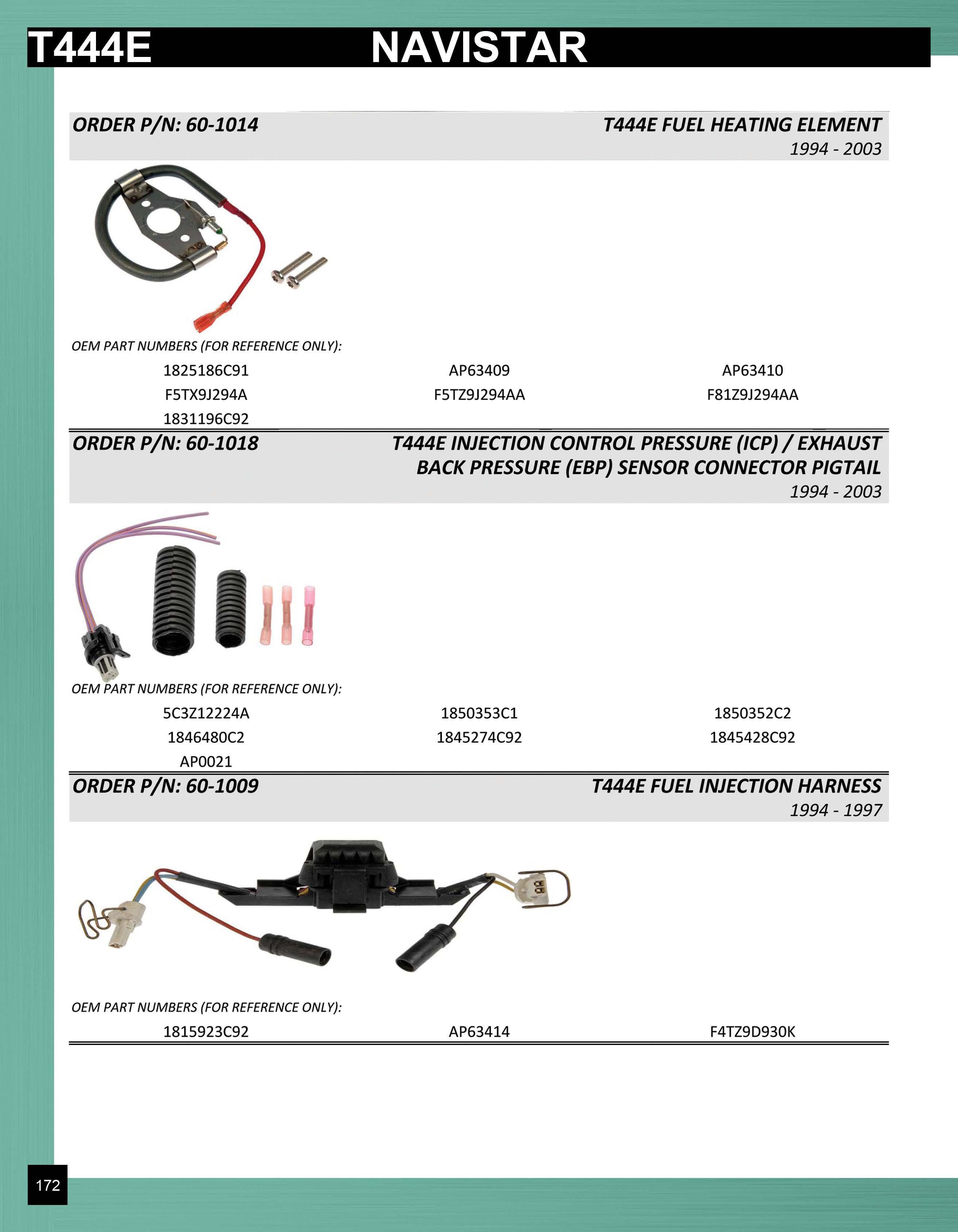 7.3L FUEL HEATING ELEMENT 1994 2003 F-SERIES, E-SERIES, EXCURSION OEM PART NUMBERS (FOR REFERENCE ONLY): F5TZ9J294A 1831196(92 F81Z9J294AA F5TZ9J294AA AP63409 7.3L INJECTION CONTROL PRESSURE (ICP) /EXHAUST BACK PRESSURE (EBP) SENSOR CONNECTOR PIGTAIL 1994 - 2003 F-SERIES, £-SERIES, EXCURSION OEM PART NUMBERS (FOR REFERENCE ONLY) : 5C3Z12224A 1846480(2 AP0021 7.3L FUEL INJECTION HARNESS 1850353(1 1845274C92 1994 1998 F-SERIES, £-SERIES (Built before 1/13/1998} OEM PART NUMBERS (FOR REFERENCE ONLY) : F4TZ9D930K 1815923(92 ORDER P/N: 60-1014 1825186(91 AP63410 ORDER P/N: 60-1018 1850352(2 1845428C92 ORDER P/N: 60-1009 AP63414