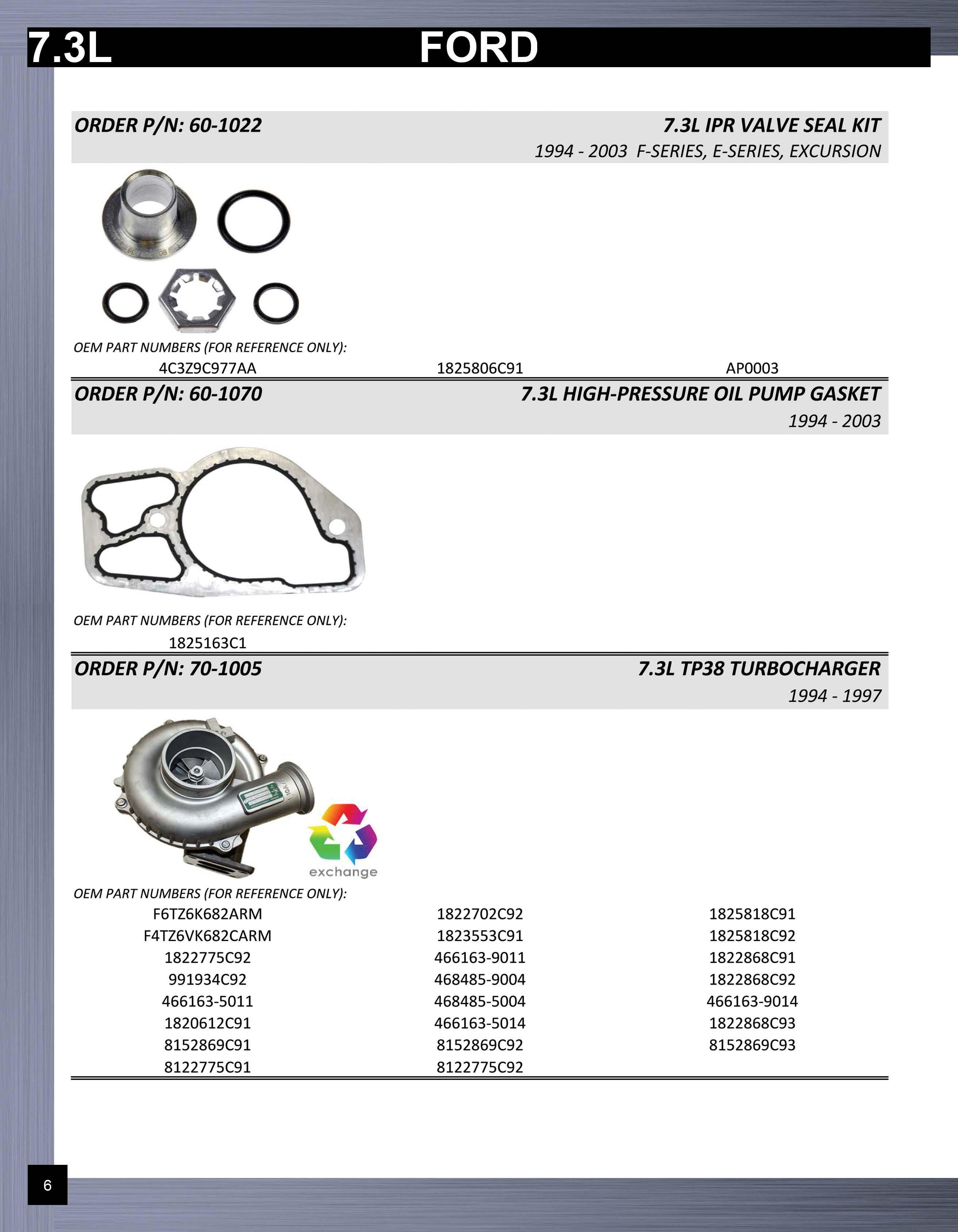 ORDER P/N: 60-1022 0 0 0 OEM PART NUMBERS (FOR REFERENCE ONLY) : 4C3Z9C977AA ORDER P/N: 60-1070 OEM PART NUMBERS (FOR REFERENCE ONLY) : 1825163C1 ORDER P/N: 70-1005 OEM PART NUMBERS (FOR REFERENCE ONLY) : F6TZ6K682ARM F4TZ6VK682CARM 1822775C92 991934C92 466163 5011 1820612(91 8152869(91 8122775(91 7.3L IPR VALVE SEAL KIT 1994 2003 F-SERIES, E-SERIES, EXCURSION 1825806C91 AP0003 7.3L HIGH-PRESSURE OIL PUMP GASKET 1994-2003 1822702(92 1823553C91 466163-9011 468485-9004 468485-5004 466163-5014 8152869(92 8122775(92 7.3L TP38 TURBOCHARGER 1994-1997 1825818(91 1825818C92 1822868C91 1822868(92 466163-9014 1822868(93 8152869(93