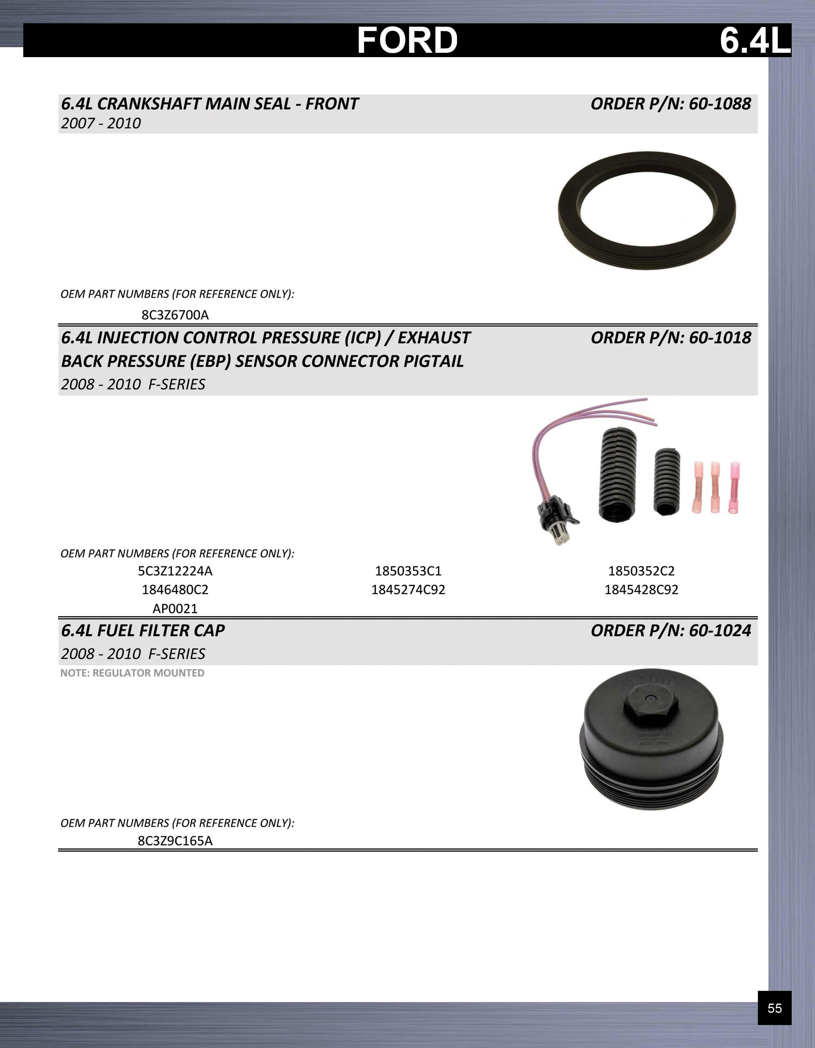 6.4L CRANKSHAFT MAIN SEAL - FRONT 2007-2010 OEM PART NUMBERS {FOR REFERENCE ONLY): 8C3Z6700A 6.4L INJECTION CONTROL PRESSURE {ICP) /EXHAUST BACK PRESSURE (EBP) SENSOR CONNECTOR PIGTAIL 2008- 2010 F-SER/ES OEM PART NUMBERS {FOR REFERENCE ONLY): 5C3Z12224A 1846480(2 AP0021 6.4L FUEL FILTER CAP 2008- 2010 F-SERIES NOTE: REGULATOR MOUNTED OEM PART NUMBERS {FOR REFERENCE ONLY): 8C3Z9C165A 18503530 1845274(92 ORDER P/N: 60-1088 ORDER P/N: 60-1018 1850352(2 1845428(92 ORDER P/N: 60-1024