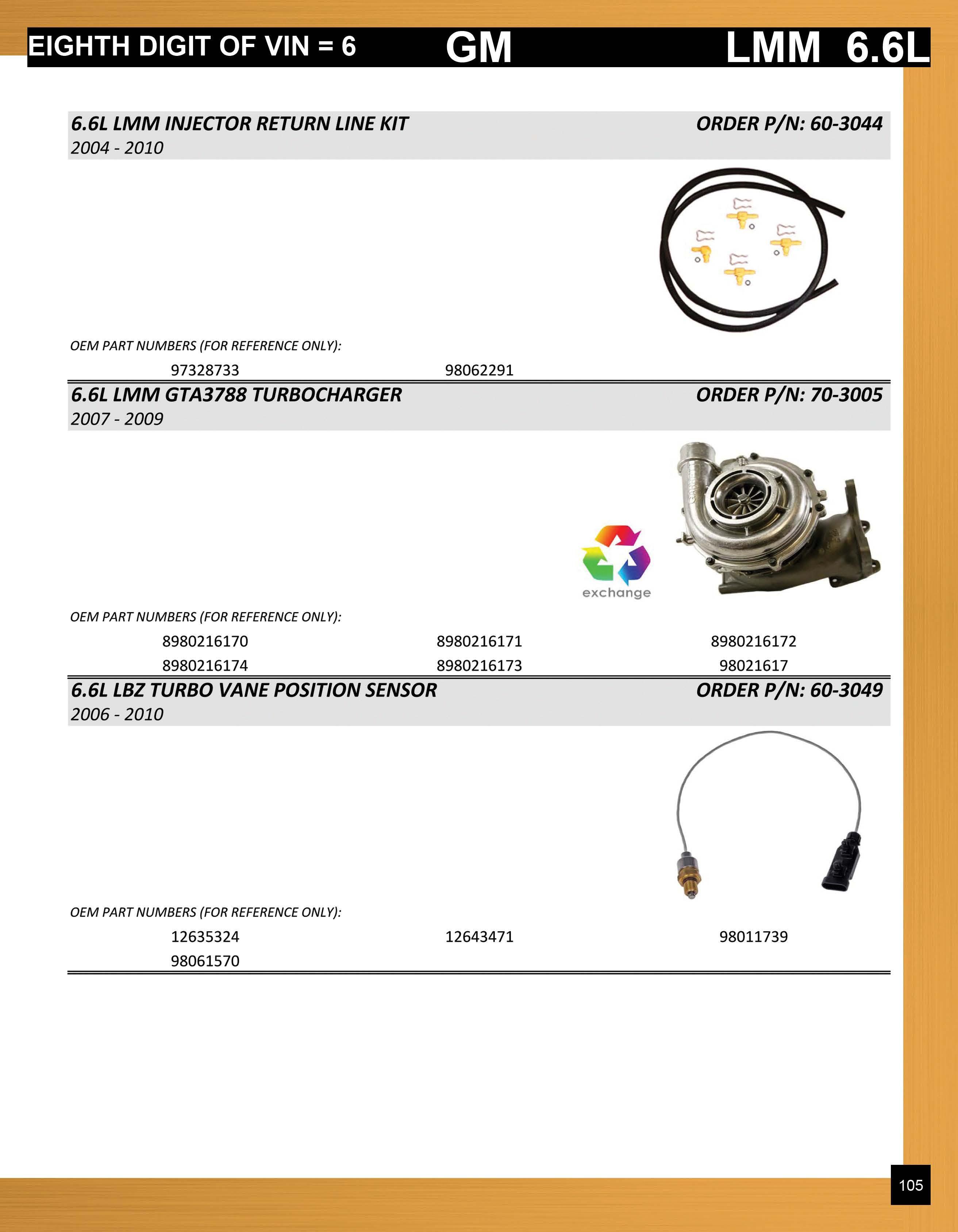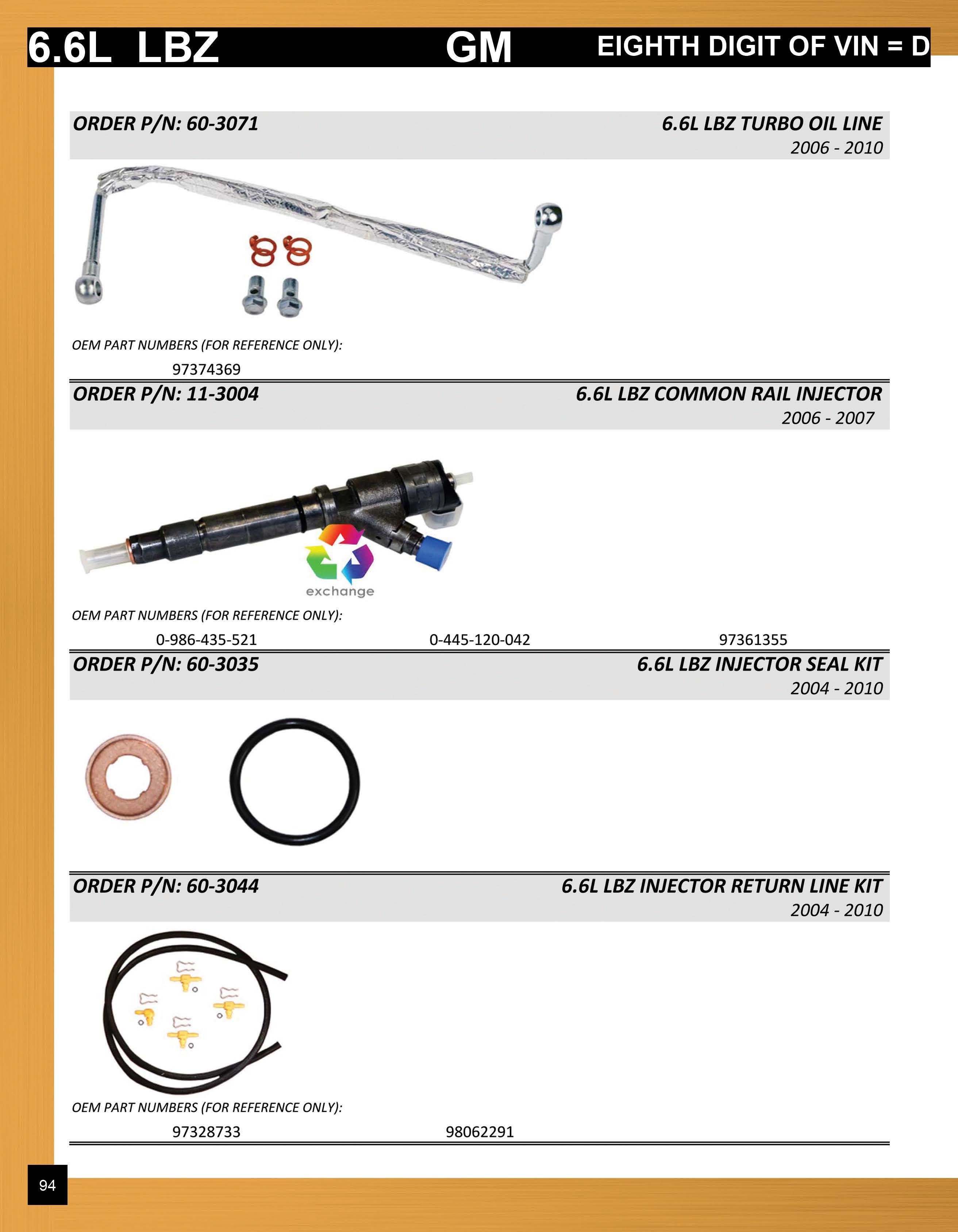 ORDER P/N: 60-1040 ORDER P/N: 60-1041 OEM PART NUMBERS {FOR REFERENCE ONLY): SC3Z9424A ORDER P/N: 60-1056 OEM PART NUMBERS {FOR REFERENCE ONLY): 4C3Z9D930AA ORDER P/N: 60-1015 OEM PART NUMBERS {FOR REFERENCE ONLY) : 6C3Z6C640C 6.0L FORD INTAKE MANIFOLD 2003 (Built before 9/2003) 6.0L MANIFOLD FORD INTAKE MANIFOLD 2003 - 2010 (Built after 9/2003} 1844137( AP63454 6.0L INJECTOR WIRING HARNESS 2003-2004 6.0L TURBOCHARGER OUTLET HOSE 2003 2004 F-SERJES, EXCURSION ---===---------