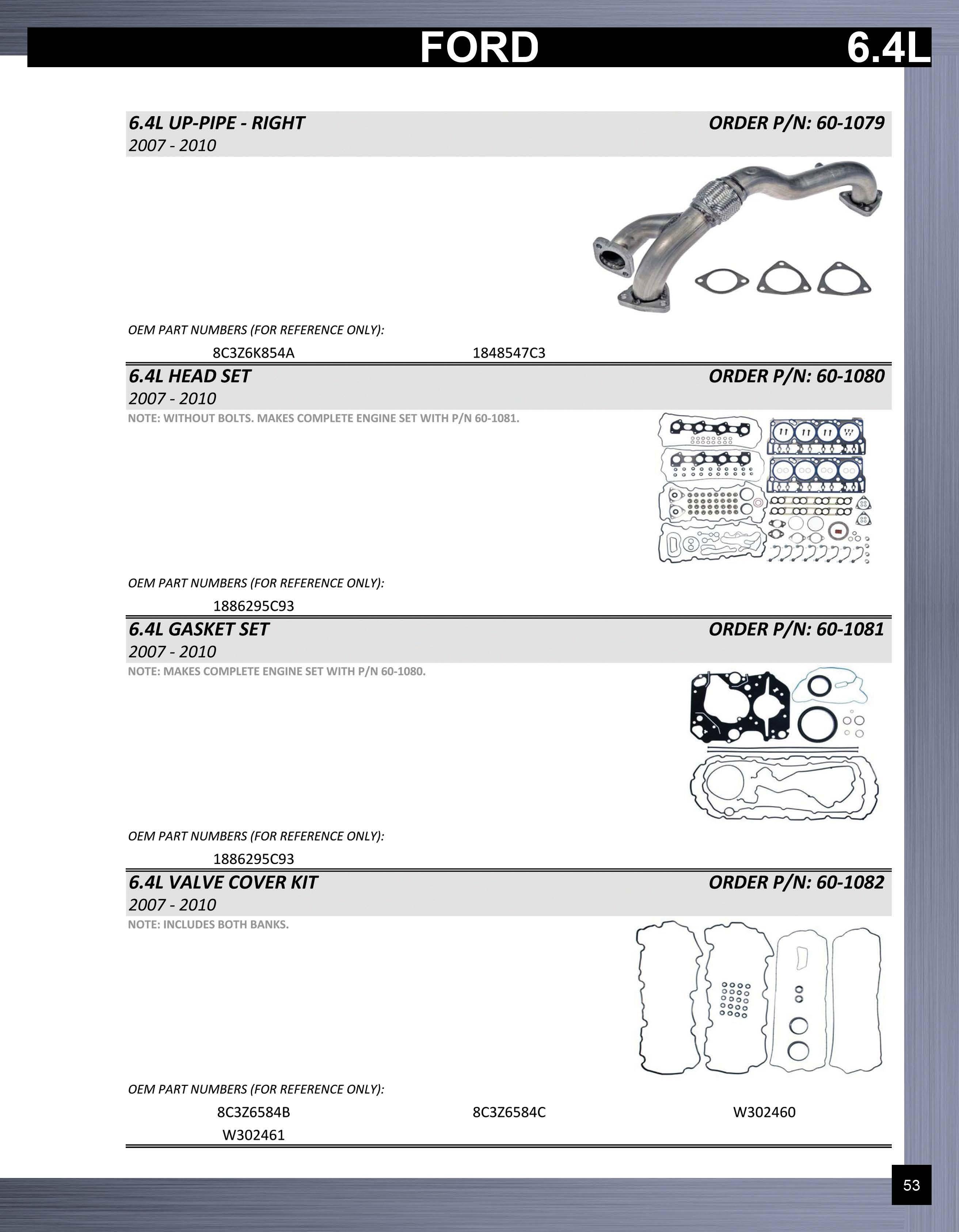 6.4L UP-PIPE- RIGHT 2007-2010 OEM PART NUMBERS (FOR REFERENCE ONLY): 8C3Z6K854A 6.4L HEAD SET 2007-2010 1848547(3 NOTE: WITHOUT BOLTS. MAKES COMPLETE ENGINE SET WITH P/N 60-1081. OEM PART NUMBERS (FOR REFERENCE ONLY) : 1886295(93 6.4L GASKET SET 2007-2010 NOTE: MAKES COMPLETE ENGINE SET WITH P/N 60-1080. OEM PART NUMBERS (FOR REFERENCE ONLY) : 1886295(93 6.4L VALVE COVER KIT 2007-2010 NOTE: INCLUDES BOTH BANKS. OEM PART NUMBERS (FOR REFERENCE ONLY): 8C3Z6584B W302461 8C3Z6584C ORDER P/N: 60-1079 ORDER P/N: 60-1080 ORDER P/N: 60-1081 ORDER P/N: 60-1082 W302460