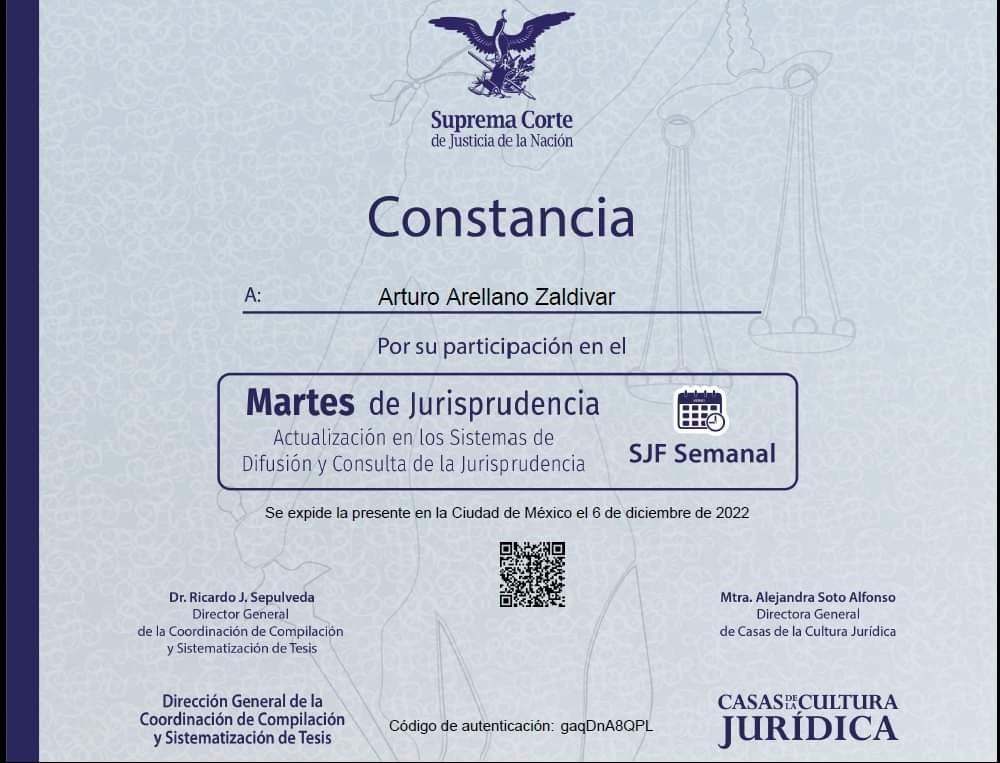 Agradezco mucho a la Suprema Corte de Justicia de la Nación y participante que me dinero la oportunidad de ser parte de su programa para estar a la vanguardia sobre las leyes y procedimiento que requiere el poder judicial de México y a los estudioso de la abogacía .. Gracias