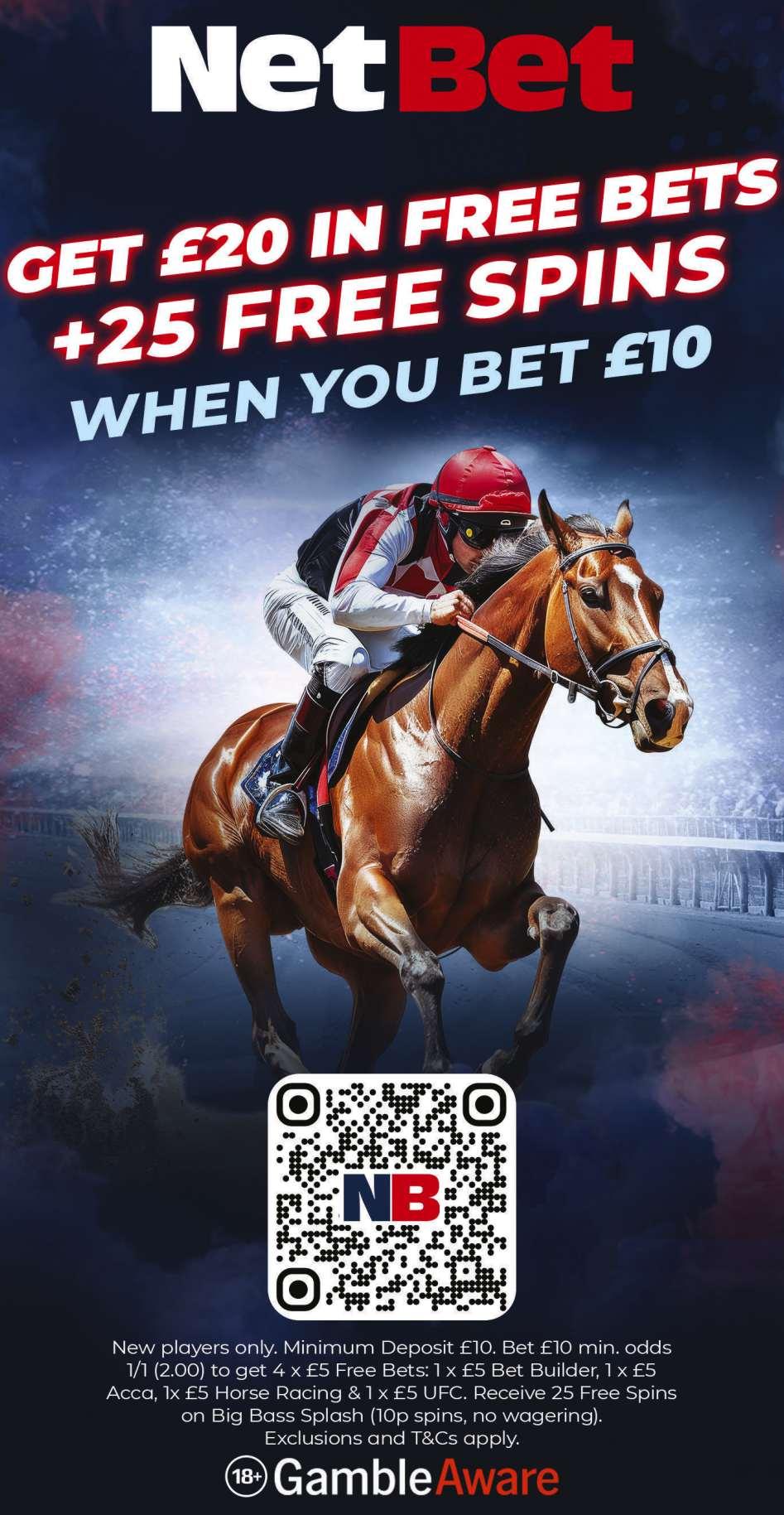 Fourth Race 7.00 - THE NETBET £5,000 CORRECT SCORE JACKPOT HANDICAP STAKES (CLASS 4) Distributed in accordance with the Stakes and Prize Money Code. £5338 to the winning horse The second to receive £2505, the third £1251, the fourth £626 and the fifth £312. for three yrs old and upwards, Rated 61-80 (also open to such horses rated 81 and 82; such horses rated 60 and below are also eligible - see Standard Conditions). £51 stake if the horse is rated 61 or higher, or £10 stake if the horse is rated 60 or lower with £41 extra if the horse is declared to run Declare by 10.00 a.m. June 30th. Lowest weight: 4-y-o and up 8st 11lb; 3-y-o 8st 5lb Highest weight: 4-y-o and up 10st 2lb; 3-y-o 9st 10lb Penalties, after June 21st, 2025, for each race won 3yo 6lb; 4yo to 6yo 5lb; 7yo and up 4lb. Netbet has kindly sponsored this race and will give a prize to the person who, in their opinion, is responsible for the horse judged to be the best turned out in this race 9 entries, 1 at £10 and 8 at £51. - Closed June 27th, 2025. Owners Prize Money. Winner £4212; Second £2106; Third £1053; Fourth £526; Fifth £263. (Penalty Value £5338.68) SS SEE PAGE 16 FOR THIS RACE.