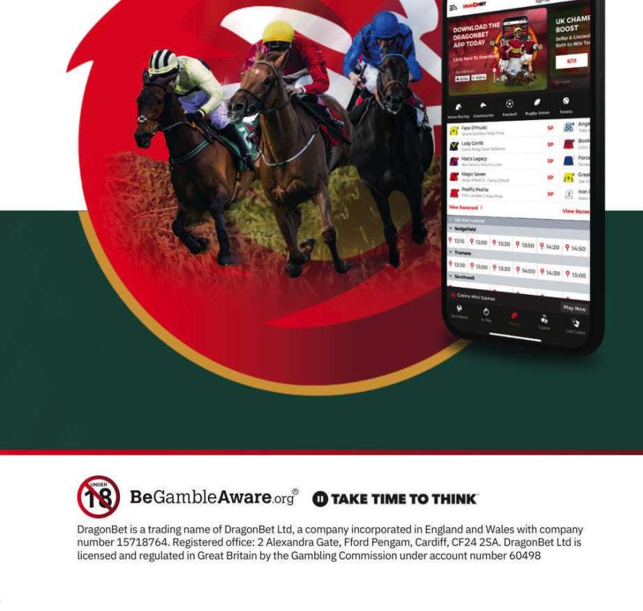 Fourth Race 8.00 - THE dragonbet.co.uk BORN FROM THE BETTING RING HANDICAP STAKES (CLASS 6) Distributed in accordance with the Stakes and Prize Money Code. £3454 to the winning horse The second to receive £1620, the third £809 and the fourth £405. for four yrs old and upwards, Rated 46-65 (also open to such horses rated 45 and below). £33 stake if the horse is rated 46 or higher, or £6 stake if the horse is rated 45 or lower with £27 extra if the horse is declared to run Declare by 10.00 a.m. July 14th. Lowest weight 8st 4lb; Highest weight 9st 9lb Penalties, after July 5th, 2025, for each race won 4yo to 6yo 5lb; 7yo and up 4lb. The sponsors will present a prize to the person who, in their opinion, is responsible for the horse judged to be the best turned out in this race. 10 entries at £33. - Closed July 10th, 2025. Owners Prize Money Winner £2725; Second £1363; Third £681; Fourth £341. (Penalty Value £3454.44) Weights raised 1lb and paragraphs 27 to 31 of the Weights and Handicapping Code complied with where applicable. SS SEE PAGE 17 FOR THIS RACE.