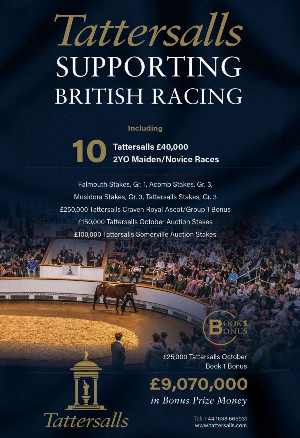 FifthRace4.15-THETATTERSALLS£40,000EBFFILLIES’NOVICESTAKES(CLASS2)(GBBRACE)DistributedinaccordancewiththeStakesandPrizeMoneyCode.£20616 to the winning horse The second to receive £9668, the third £4836, the fourth £2416, the fifth £1208 and the sixth £604. for novice two yrs old fillies only, which are E.B.F eligible. Enter by noon, April 29th and pay £200 stake, Declare by 10.00 a.m. May 3rd. Weights: 9st 2lb each Penalties, for each Restricted Novice or Maiden race won 4lb For each other race won 7lb (Sellers and Claimers excluded forthe purposes ofpenalties) TATTERSALLS has kindly sponsored this race and donated £10,000 towards the prizemoneyforthisrace Theywillpresentamementotothewinningowner,trainerandjockey Inaddition,theywillawardacashprizetothestableemployeeresponsible forthe bestturned out horse inthis race The British HorseracingAuthority’s Development Fund has generouslycontributed £4000towardsthe prize moneyforthis race All number cloths to be carried in this race have been sponsored and will carrythe name/logo ofTattersalls.The sponsorship payment of£250 will be distributed equally amongst all horses starting inthis race in accordancewith paragraphs 24to 27 ofthe Stakes and Prize MoneyCode. 19 entries at £200 - ClosedApril 29th, 2024 Owners PrizeMoney.Winner£16252;Second£8128;Third£4064;Fourth£2032;Fifth£1016;Sixth£508.(PenaltyValue£20616)ASS SEE PAGE 64 FORTHIS RACE. SixthRace4.50-THETATTERSALLS£40,000EBFNOVICESTAKES(CLASS2)(GBBRACE) Distributed in accordancewiththe Stakes and Prize MoneyCode. £20616tothe winning horse The second to receive £9668, the third £4836, the fourth £2416, the fifth £1208 and the sixth £604. for novice two yrs old, which are E.B.F eligible. Enter by noon,April29thandpay£200stake,Declareby10.00a.m.May3rd.Weights:Coltsandgeldings9st4lb;fillies8st13lbPenalties,foreachRestrictedNoviceorMaidenrace won 4lb For each other race won 7lb (Sellers and Claimers excluded forthe purposes of penalties) TATTERSALLS have kindly sponsored this race and will donate £10,000 towards the prize money of the race The will award a memento the winning owner, trainer and jockey in the race In addition, they will award a cash prize to the stable employeeinchargeofthehorsejudgedtobebestturnedoutintherace TheBritishHorseracingAuthority’sDevelopmentFundhasgenerouslycontributed£4000towards theprizemoneyforthisrace Allnumberclothstobecarriedinthisracehavebeensponsoredandwillcarrythename/logoofTattersalls.Thesponsorshippaymentof£250 will be distributed equallyamongst all horses starting inthis race in accordancewith paragraphs 24to 27 ofthe Stakes and Prize MoneyCode. 11 entries at £200 - Closed April 29th, 2024 OwnersPrizeMoney.Winner£16252;Second£8128;Third£4064;Fourth£2032;Fifth£1016;Sixth£508.(PenaltyValue£20616)Weightsraised3lband paragraphs27to31oftheWeightsandHandicappingCodecompliedwithwhereapplicable.ASS SEE PAGE 68 FORTHIS RACE.
