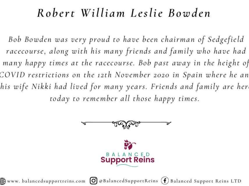 Sixth Race 3.35 - THE BALANCED SUPPORT REINS BOB BOWDEN MEMORIAL NOVICES’ HANDICAP STEEPLE CHASE (CLASS 4) (GBB RACE) Distributed in accordance with the Stakes and Prize Money Code. £6970 to the winning horse The second to receive £3211, the third £1605, the fourth £803, the fifth £350, the sixth £350 and the seventh £350. for novice four yrs old and upwards, Rated 0-120 (also open to such horses rated 121 and 122 see Standard Conditions). £64 stake if the horse is rated 94 or higher, or £12 stake if the horse is rated 93 or lower with £52 extra if the horse is declared to run Declare by 10.00 a.m. November 1st. Penalties, after October 22nd, 2022, for each steeple chase won 7lb. 12 entries, 1 at £12 and 11 at £64. Closed October 28th, 2022. Owners Prize Money. Winner £5341; Second £2671; Third £1335; Fourth £668; Fifth £280; Sixth £280; Seventh £280. (Penalty Value £6970.88)