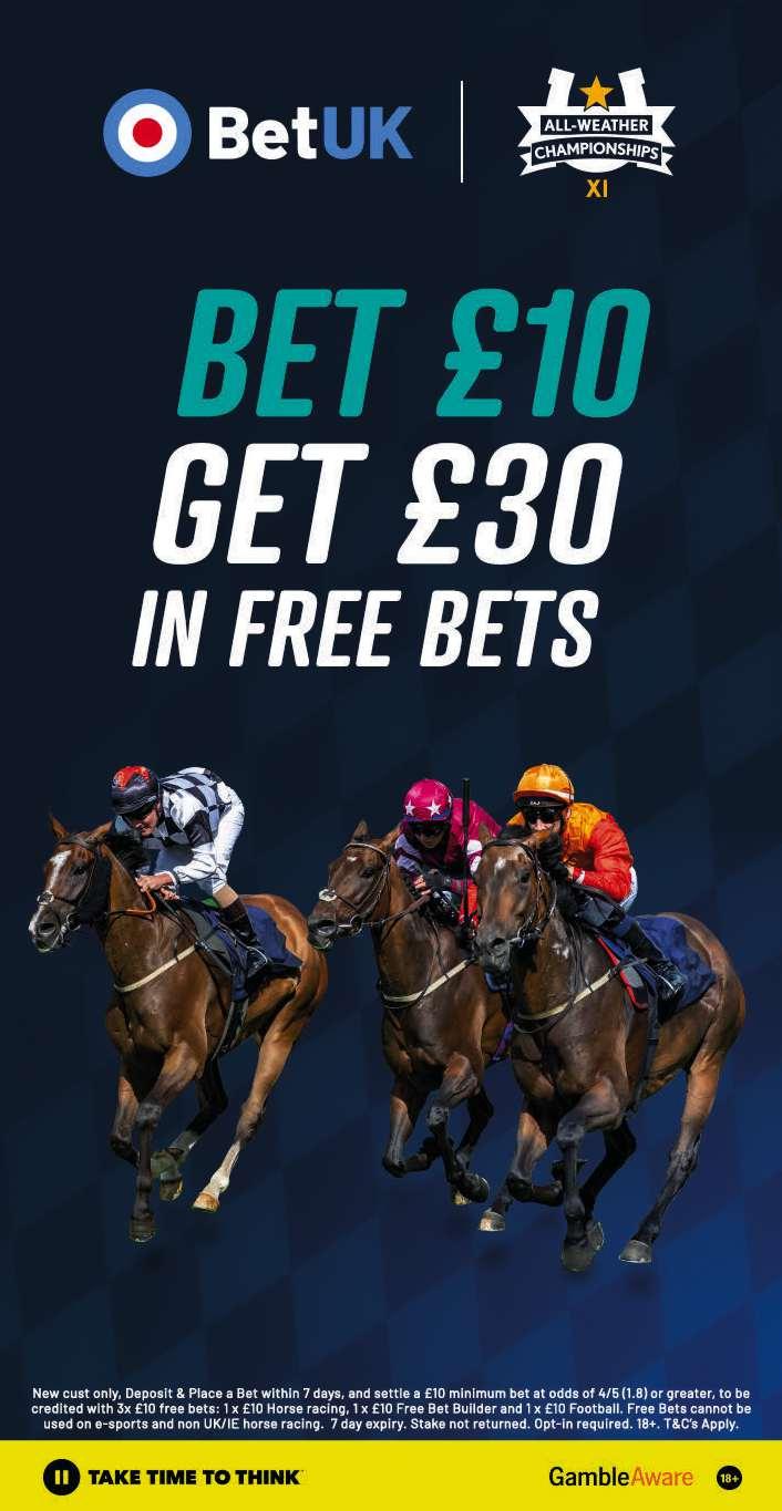 Fifth Race 6.15 - THE WEEKLY £5 FREE BET WITH BETUK HANDICAP STAKES (CLASS 4) (Rider Restricted Race) Distributed in accordance with the Stakes and Prize Money Code. £4972 to the winning horse The second to receive £2333, the third £1165, the fourth £583 and the fifth £290. for four yrs old and upwards, Rated 66-85 (also open to such horses rated 86 and 87; such horses rated 65 and below are also eligible - see Standard Conditions). £47 stake if the horse is rated 66 or higher, or £9 stake if the horse is rated 65 or lower with £38 extra if the horse is declared to run Declare by 10.00 a.m. February 19th. Lowest weight 8st 4lb; Highest weight 9st 9lb Penalties, after February 8th, 2025, for each race won 4yo to 6yo 5lb; 7yo and up 4lb. BetUK has kindly sponsored this race and will provide the person responsible for the horse judged to be the best turned out with £25. NOTE: THIS IS A RIDER RESTRICTED RACE This race is restricted to riders who are licensed as Flat jockeys in Great Britain and have ridden 30 or fewer winners in Flat races in Great Britain during a specified period of 12 months. Eligible riders must hold a licence in Great Britain. A list of eligible riders was published on the Racing Admin website on 2 January, 2025. Only riders from this list are eligible to ride at this fixture. 14 entries at £47. - Closed February 15th, 2025. Owners Prize Money Winner £3923; Second £1962; Third £980; Fourth £490; Fifth £245. (Penalty Value £4972.30) SS SEE PAGE 16 FOR THIS RACE.
