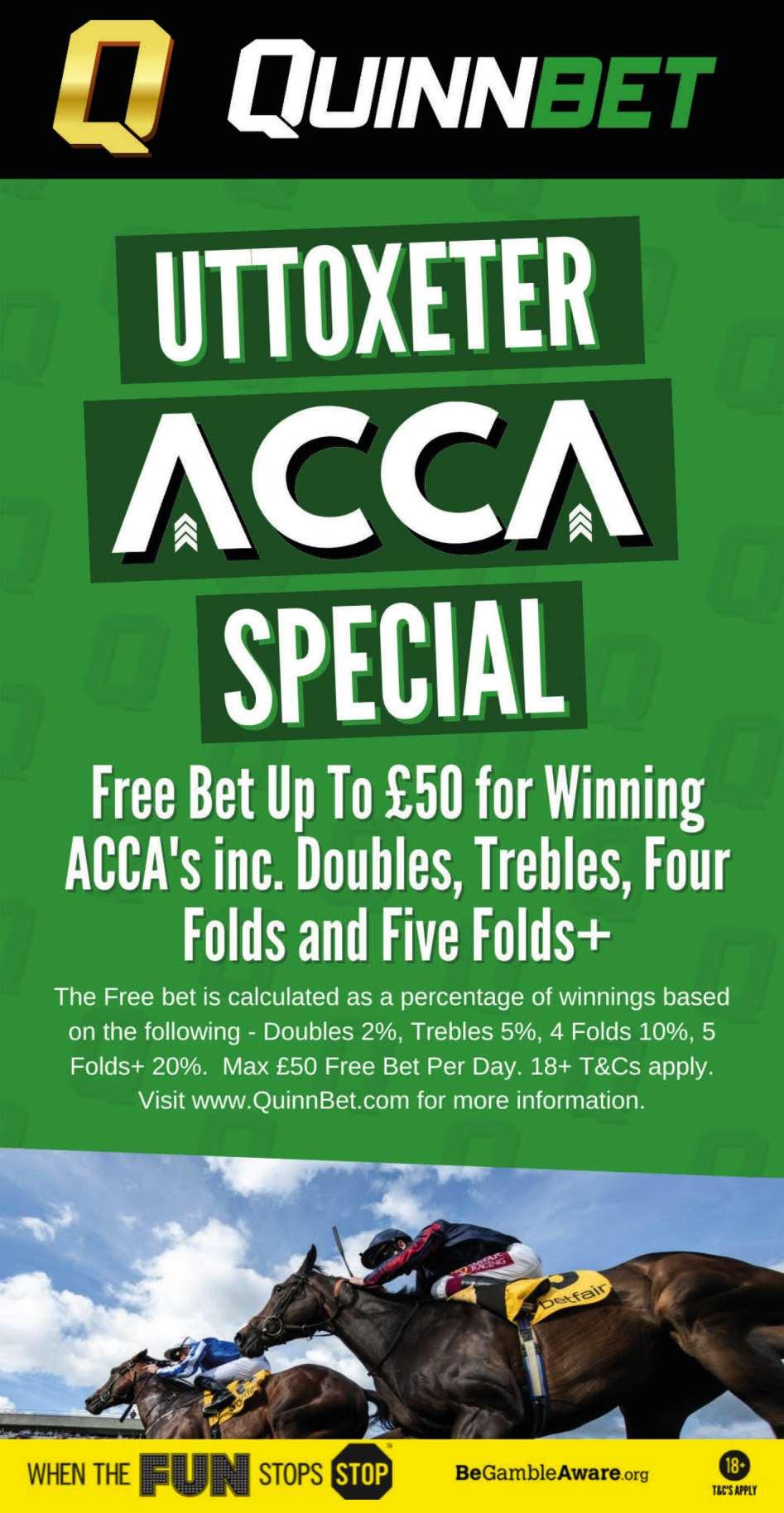 Seventh Race 3.42 - THE QUINNBET DAILY FREE BET NOVICES’ HANDICAP STEEPLE CHASE (CLASS 4) (GBB RACE) Distributed in accordance with the Stakes and Prize Money Code. £5281 to the winning horse The second to receive £2430, the third £1215, the fourth £608 and the fifth £303. for novice five yrs old and upwards, Rated 0-120 (also open to such horses rated 121 and 122 - see Standard Conditions). £50 stake if the horse is rated 94 or higher, or £10 stake if the horse is rated 93 or lower with £40 extra if the horse is declared to run Declare by 10.00 a.m. January 26th. Penalties, after January 21st, 2023, for each steeple chase won 7lb QUINNBET has kindly sponsored this race. In addition, they will give a prize to the person who, in their opinion, is responsible for the horse judged to be the best turned our in this race. 14 entries at £50. - Closed January 23rd, 2023. Owners Prize Money. Winner £4039; Second £2019; Third £1010; Fourth £505; Fifth £252. (Penalty Value £5281) Weights lowered 4lbs.