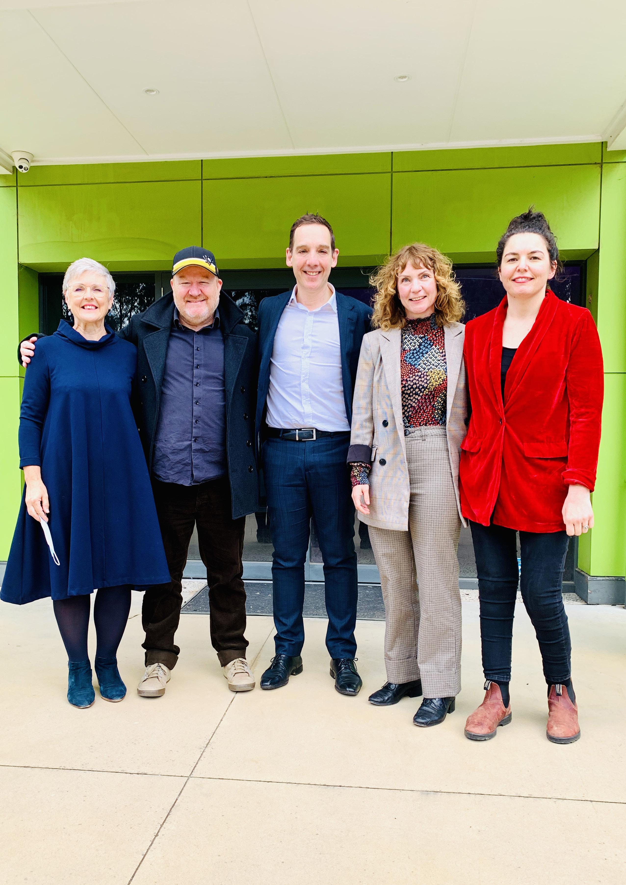 L-R: Anne Henshall - Chair, Christian Leavesley - Artistic Director, Steve Dimopoulos - Victorian Minister for Creative Industries, Gemma Robertson - Executive Director, Eliza Hull - Artistic Associate, Access & Inclusion. July 2022. Image: Kerry Brown