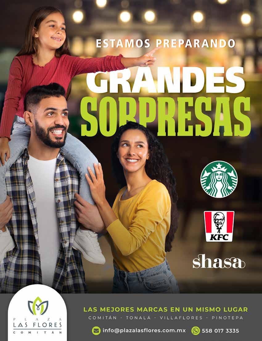 Este ejemplar está en tus manos gracias al patrocinio de: San Marcos, Itálika Kólob, Grupo Industrial López Pérez, El Nenúfar Coffee House, Restaurante Comitán lindo y qué rico, Cosita Bu, Casa Bonita, Restaurante Los Caramelos, Balam Café, Café Orquídea, Gardenia´s Shop, Café Oh la-latte, Restaurante La Estación, Terra Hogar, Coafise, Grumo, Proveedora Cultural de Comitán, PeopleSports, Café Naruma, Pillangó Café, Chocolatera K’ox, Café Kabil, Tasca Chapata, Pan Compuesto, Laboratorio San Francisco, Dr. José Ramón Mazariegos Díaz, Servicio Camacho, Hotel Edelmira, Hotel Posada del Ángel, Soy Mamá, Plaza Las Flores, Hotel Tierra Viva, Hotel Corazón del Café, Hotel Puerta Sur, Josmap, Moo Duk Kwan, Hotel La Casa del Marqués, Abarrotes San Luis, Lonas del Sureste, Auditivos de Comitán, Brendás Joyería, Blush Belleza, La Súper 99.7, Colegio Frida Kahlo, Honda, TVS motores y refacciones, Asesores en Seguros Penagos Ruiz, Eolo fábrica de persianas, y El Maguey Barbacoa. Empresas comprometidas con el desarrollo cultural de Comitán y la región.