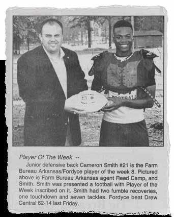 A photo of Camp presenting the ball to Chambers appeared in next week’s Fordyce News-Advocate. The caption included “Farm Bureau” as will all the game ball winner announcements the remainder of the season in the paper.