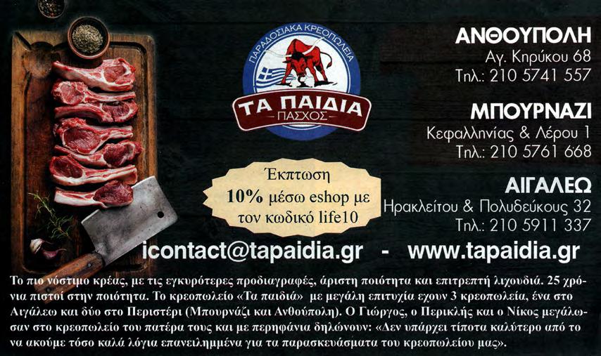 Ιπποκράτης: Διονύσης Γεροντής, Φώτης Δημητρα κόπουλος. Χρυσούπολη: Άνθιμος ΑNOIKTA KAΘΗΜΕΡΙΝΑ ΑΠΟ ΤΟ ΜΕΣΗΜΕΡΙ (13.00) ΣΥΝ Α ΝΤ Ή Σ Ή ΤΩΝ ΟΜ Α ΔΩΝ ΜΕ ΑΤΡ Ο Μ Ή ΤΟ ΣΤΟ ΜΑΖΑΡ Α Κ Ή Πελασγίας 17, Περιστέρι 2105771600 Έδεσσης 3, Νίκαια 2104904409 Θηβών 381, Αιγάλεω 2105910404 kreopwleialeventis www.kreopwleialeventis.gr Κρεοπωλεία Λεβέντης Premium Meats& Deli Τα κρεοπωλεία Λεβέντης είναι µια οικογενειακή επιχείρηση που ξεκίνησε από τον παππού µας Aνδρεά λεβέντη στο Γαλάτσι το µακρινό 1954. Έχοντας αισίως φτάσει ήδη στην τρίτη γενιά µε την αγάπη και την στήριξή σας ατενίζουµε το µέλλον µε αισιοδοξία, όνειρα και σχέδια. ∆ραστηριοποιούµαστε στον τοµέα εµπορίας κρεάτων και τροφίµων διαθέτοντας τρία σηµεία πώλησης χονδρικής και λιανικής. Στα καταστήµατα µας θα βρείτε µεγάλη ποικιλία και επιλογές κρεάτων από τις µεγαλύτερες φάρµες της Ελλάδας και τους πιο αξιόπιστους οίκους του εξωτερικού στις πιο ασυναγώνιστες τιµές στην ανώτερη ποιότητα. Χαρίστε στους αγαπηµένους σας το καλύτερο από το κατάστηµά µας κατευθείαν στο τραπέζι σας. Πελασγίας 17, Περιστέρι 2105771600 Έδεσσης 3, Νίκαια 2104904409 Θηβών 381, Αιγάλεω 2105910404 kreopwleialeventis www.kreopwleialeventis.gr Κρεοπωλεία Λεβέντης Premium Meats& Deli Τα κρεοπωλεία Λεβέντης είναι µια οικογενειακή επιχείρηση που ξεκίνησε από τον παππού µας Aνδρεά λεβέντη στο Γαλάτσι το µακρινό 1954. Έχοντας αισίως φτάσει ήδη στην τρίτη γενιά µε την αγάπη και την στήριξή σας ατενίζουµε το µέλλον µε αισιοδοξία, όνειρα και σχέδια. ∆ραστηριοποιούµαστε στον τοµέα εµπορίας κρεάτων και τροφίµων διαθέτοντας τρία σηµεία πώλησης χονδρικής και λιανικής. Στα καταστήµατα µας θα βρείτε µεγάλη ποικιλία και επιλογές κρεάτων από τις µεγαλύτερες φάρµες της Ελλάδας και τους πιο αξιόπιστους οίκους του εξωτερικού στις πιο ασυναγώνιστες τιµές στην ανώτερη ποιότητα. Χαρίστε στους αγαπηµένους σας το καλύτερο από το κατάστηµά µας κατευθείαν στο τραπέζι σας.
