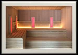 Hemos incorporado la última versión de sauna, línea GENEVE. En esta línea, donde prima el acabado de ultima generación y un desarrollo moderno y atractivo, que unida a un diseño totalmente novedoso y exclusivo, ha dado como resultado una sauna de altísimo nivel e incomparable atractivo. Esta nueva versión incorpora todos los elementos de las versiones de alta gama, y proporciona un acabado excepcional al combinar revestimiento interno en disposición horizontal y perfiles verticales, Además de incorporar elementos de serie como el frontal acristalado sin marco inferior, la cromoterapia RGB LED en reposa-espaldas y la tarima de suelo tipo parque.