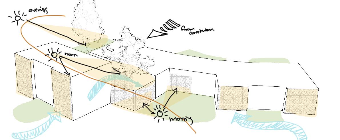 The buildings are spatially organized to optimize passive solar gain and natural ventilation. The positioning of the structures is informed by the site’s orientation to maximize the entry of morning light, thus enhancing energy efficiency and the overall indoor environment.