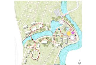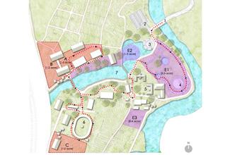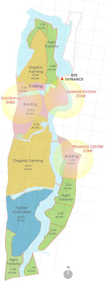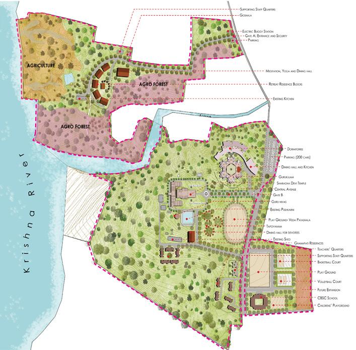 A comprehensive layout illustrating the land division based on topography, integrating agroforestry, educational spaces, and retreat centers in harmony with the natural terrain