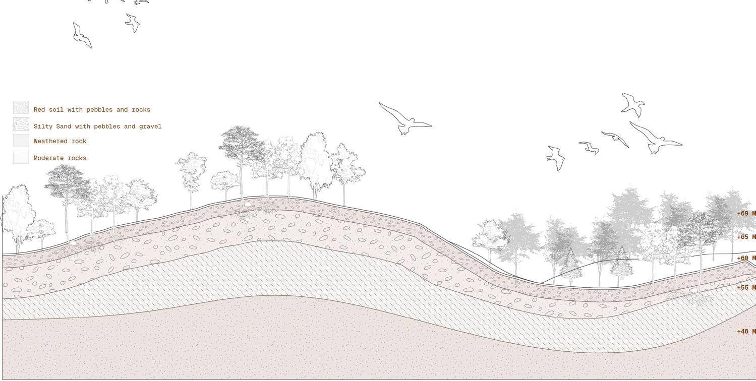 The Vedalaya project is an architectural response to the challenges of building sustainably in a region with harsh climatic conditions and complex soil dynamics. Situated on the banks of the Krishna River, the 100-acre site presented unique challenges due to its expansive soil, which cracks and contracts with changing weather.
