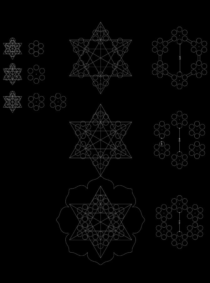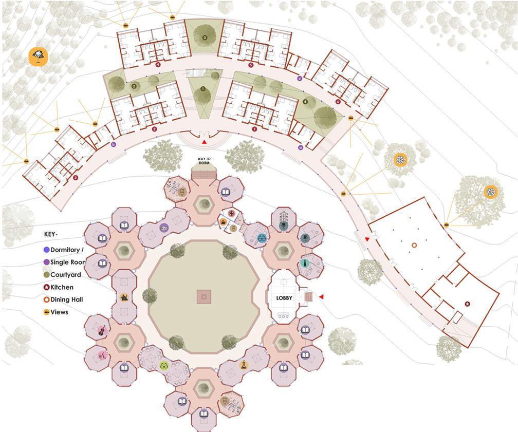 This aerial perspective highlights the Gurukulam and its dormitory, accommodating 200 individuals. The design draws inspiration from the Saraswati Yantra, a sacred geometric symbol representing knowledge and energy. The Gurukulam features interconnected octagonal units strategically positioned to maximize morning sunlight and natural ventilation. These octagons are grouped around courtyards, creating spaces for outdoor learning. The dormitory, built on two levels to follow the site’s natural contours, is designed to optimize wind flow and sunlight, ensuring a comfortable and sustainable living environment.