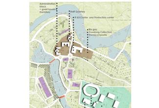 The development includes multiple functional areas: a Ghoshala, an administration block, an exhibition center, and a Training center. The landscape is thoughtfully integrated with walking trails, providing a direct connection to the environment and promoting learning through interaction. The forest trail allows visitors to experience and understand the importance of living in harmony with nature.