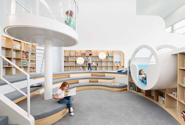 Laste raamatukogu kui loov keskkond. Toolivaba ruum ergutab iseseisvat ja loovat mõtlemist ning soosib ettevõtlikkust: kus oleks siin mõnus raamatut uurida ja millises asendis? Alumisel pildil Sidney mängukeskus, Austraalia. Sisearhitektuur PAL Design / Foto: Michelle Young