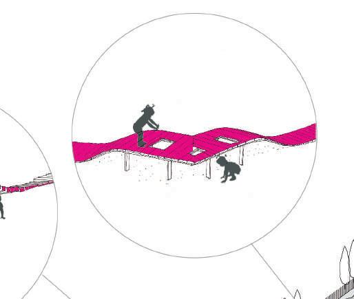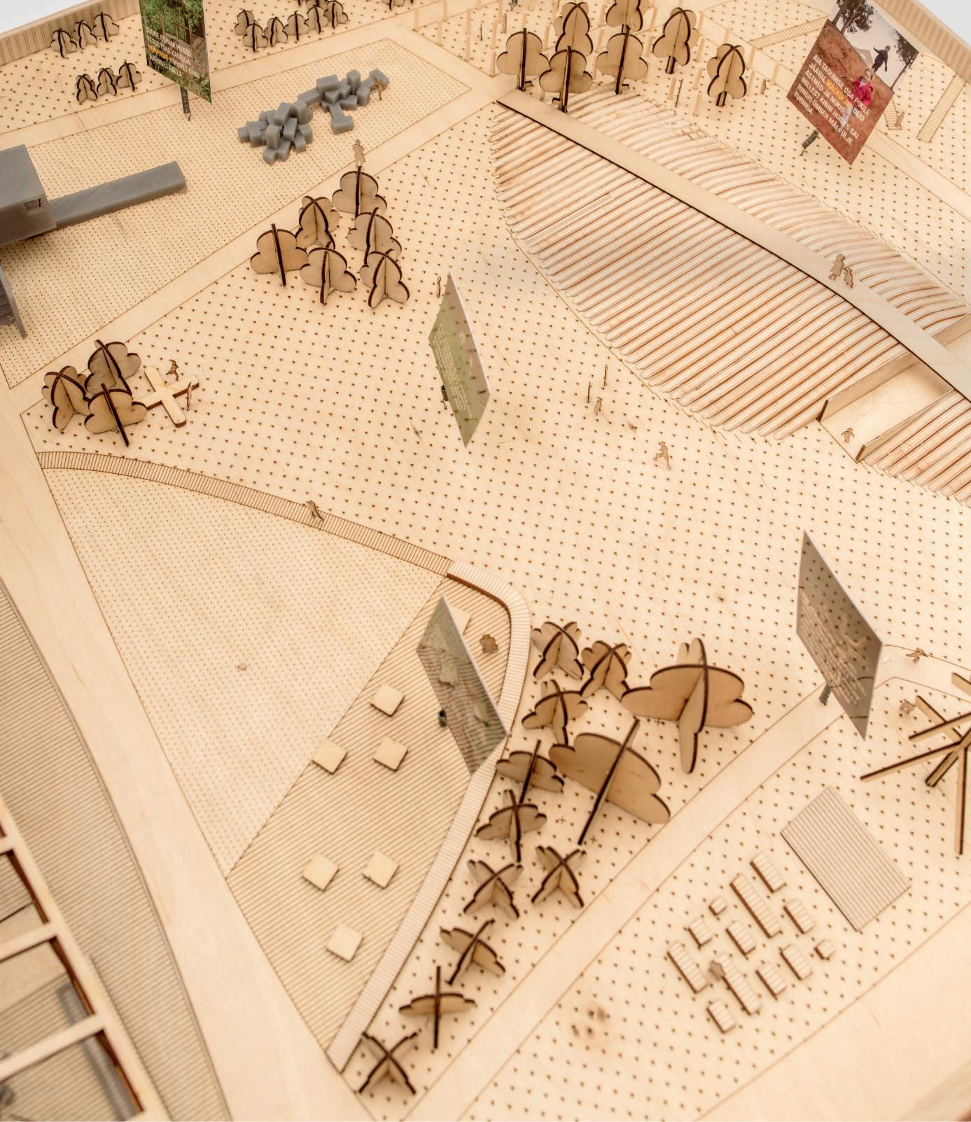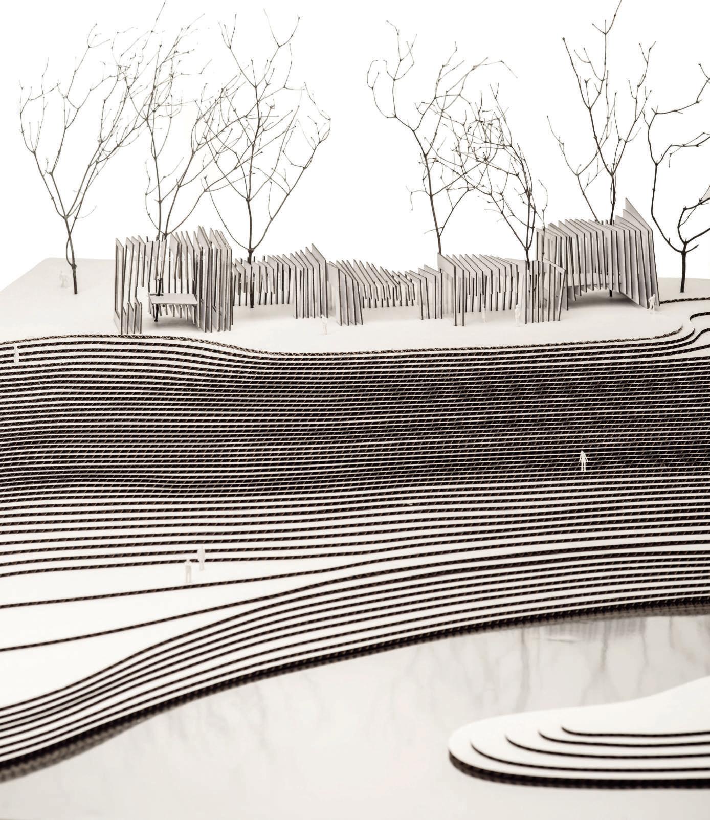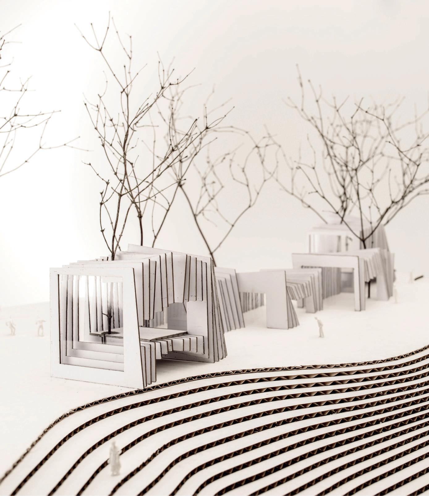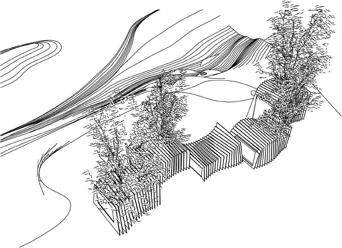 kt k aos arhitektide näitusetöö ongi juba jutuks tulnud õuelasteaia kontseptsioonist ajendatud. nad valisid asukohaks Pirita jõekääru, kus on huvitav maastik ja mets. erinevad varjualused ei eralda lapsi loodusest, vaid loovad arvukalt loodusega vahetult seotud poolruume.