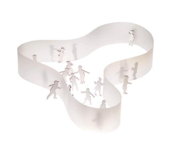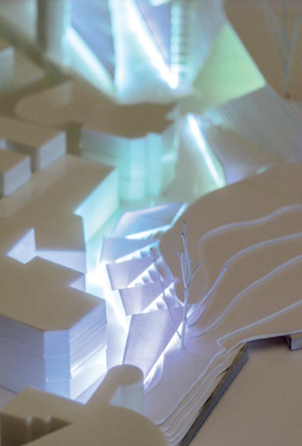 g M: Mingist hetkest muutuvad lapse ehitamised väikestest suurteks – laps ei ehita enam enda ette maailma mudelit, vaid iseenda suuruses maailma: onne, kindluseid, pesasid. siis oleks kindlasti väga huvitav tegutseda muudetavas ruumis. see on küsimus, kui lakooniline selline ruum peaks olema, et laps võiks seda ükskõik milleks kujutleda. näeme oma kooliminevate rühmade pealt, et neil käib kogu aeg mäng. alles õueminekut oodates lepivad nad kokku, kes on milline tegelane, ja juba siin trepi peal on neil mingi oma ruum tekkinud, kus nad tegutsevad. seda trepipealset ei saa muuta kuidagi, aga neid see ei sega. teisalt oleks aktiivne mäng ruumi endaga mingis vanuses kindlasti väga tore. selline nendepikkune, painduv ja painutatav ruumisuurune lint tekitaks tohutu mänguvõimaluse.