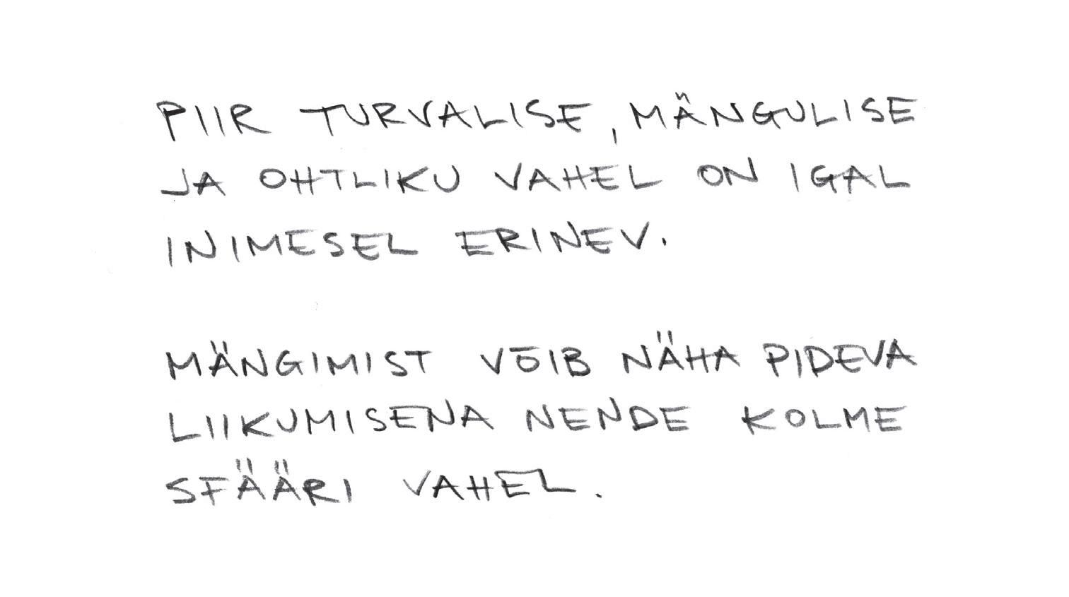 kõik kolm mängu eeltingimust – turvalisus, reeglitest tulenev lihtsustus, mugavustsoonist väljumine – on ühel või teisel moel seotud piiridega: turvalisus tähendab kaitsvaid piire; mängureeglite kehtestamine ei ole muud kui lubatud ja lubamatute tegude vahel mängusisese piiri tõmbamine; mugavustsoonist väljumine tähendab turvapiiride ületamist ja oma taluvuspiiride kompamist reeglitega lubatud viisil. veel enam, mäng ei ole üksnes piiride sees. siin võetakse piirid ka ise mängu: tegutsetakse piiri peal, et ära tunda piire enda ja teiste vahel (nt millal on liiga kaugele mindud) ning avardada neid enda sees (nii mugavuse kui ka taluvuse osas). Just piiripealne olek muudab mängu pingeliseks, tõmbab meid üleni endasse, nii et kaotame aja- ja endataju, ning sunnib meid kõike välja panema. Piirid on mängu puhul huvitavas olekus: need on ühtaegu nii kehalised (füüsilised takistused, võimekuse piirid) kui ka vaimsed (emotsionaalsed, mõttelised piirid), ilma et neid kahte aspekti oleks võimalik selgekujuliselt lahutada. kehalise ja vaimse eristamatus näib üldse mänguga kaasas käivat. heaks näiteks on siin mänguasjad. Mul on miskipärast siiani meeles erik Morna nupuke aastatetagusest eesti ekspressist, kus ta kirjutas, et ta poeg mängis kõige kauem mänguautoga, mis oli lihtne ratastega puuklots. Mudelautoga sai mängida üksnes ühte autot, aga klotsiauto oli vastavalt vajadusele kallur, rallikas või miski, millel polegi nime. niisiis, huvitaval mänguasjal on küll keha, aga see on kujul, mis lubab tal osaleda erinevates fantaasiates, olla meie unistuste kandja – vaimuasi. käesolev kataloog on lasteaedadest. arvestades mängu tähtsust laste jaoks, võiks olla ilmne, et lasteaed on ennekõike mängimise ruum. võrreldes nõukogude aja standardiseeritud, ebaõdusate kohtadega on eestis ehk üksjagu samme selles suunas juba astutud, tehtud lasteaedu turvalisemaks.[5]