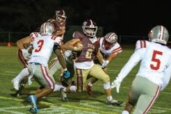 (Bottom left) Senior Matt Uzar gets surrounded while trying to get to the end zone against Catholic Memorial on Sept. 23. PHOTO OWEN JONES