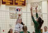 (Middle right) Sophomore Ella Poultney hits the ball over the net during the CMADA finals game on Oct. 29, 2022. The Algonquin girls volleyball team beat Wachusett 3-0. PHOTO BETSY BERTONAZZI