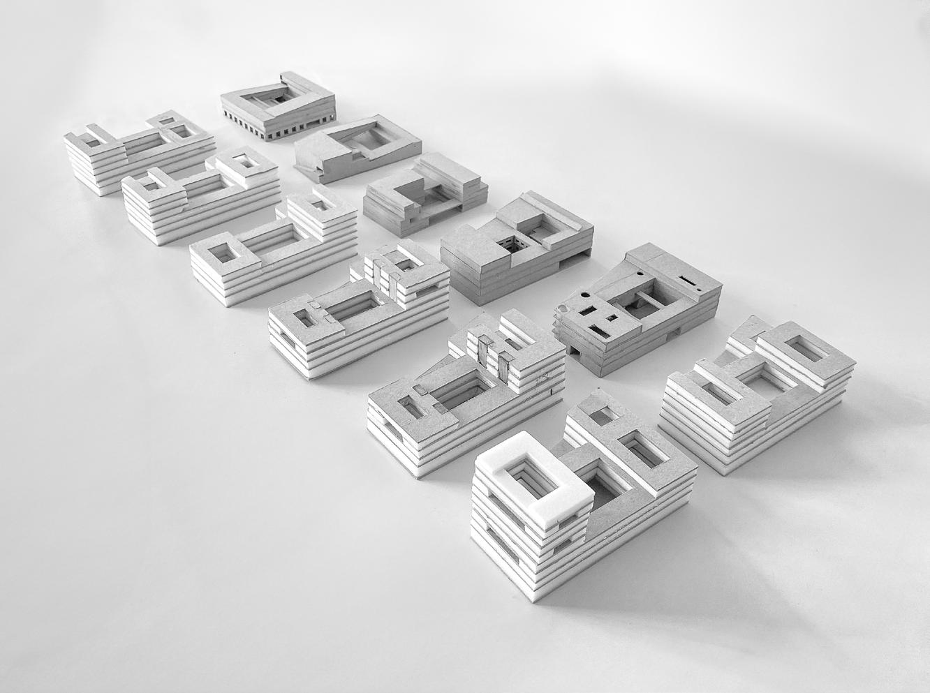Palazzi-patio’s op het gelijkvloers, om te vormen tot terrassen op meerdere verdiepingen. De H, 0, B en U configuratie van Palazzi, zoals eerder vermeld in mijn schema’s, boden mij de mogelijkheid om verschillende terrassen te creëren. Ik heb bewust gekozen om de terrassen en openingen zichtbaar te maken in de gevels, zodat hun aanwezigheid voelbaar is. De locatie van de terrassen is niet alleen in relatie tot de interne architectonische werking, maar ze werden ook gebruikt om licht en uitzicht te sturen. Kortom, de randvoorwaarden hebben een belangrijke rol gespeeld bij de positionering van de terrassen en hebben bijgedragen aan de totstandkoming van mijn ontwerp.