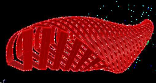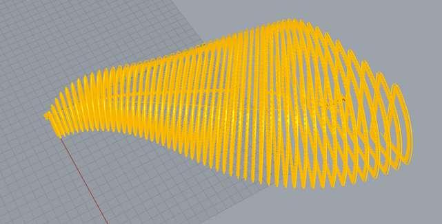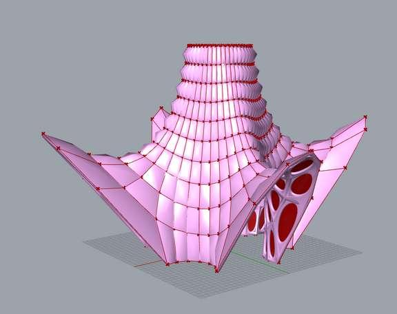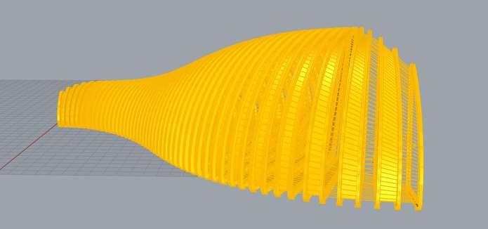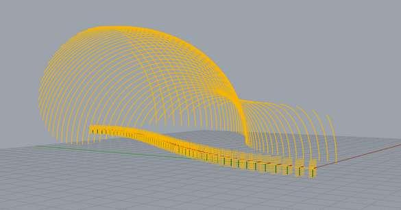 Lo que se observa a continuación en las imagenes fue como mediante la programación del grasshopper la cobertura se fue modelando en base al modelo enviado en YouTube, comenzando por una simple linea curva que se fue trasformando en el producto final, que es colocado en el proyecto de diseño arquitectónico.