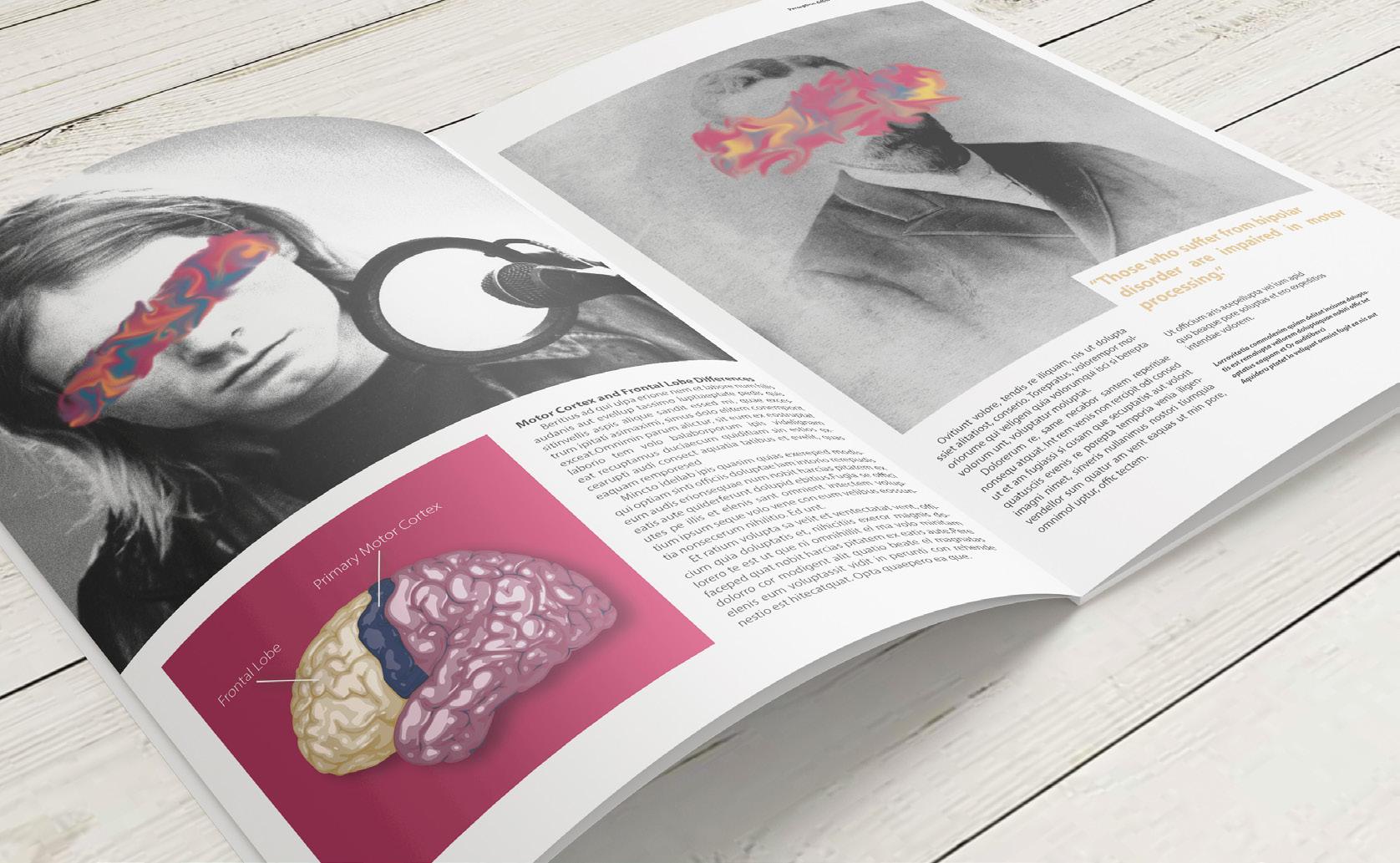 When designing the cover as well as the inside, I knew I wanted to tie in the disorientation that can arise from having facial recognition issues. The moving multicolored elements paired with faces felt like the most accurate representation of this. Featured on the inside are two well known sufferers of bipolar disorder, Kurt Cobain and Vincent Van Gogh. The final illustration depicts parts of the different brain that are affected by this disorder.