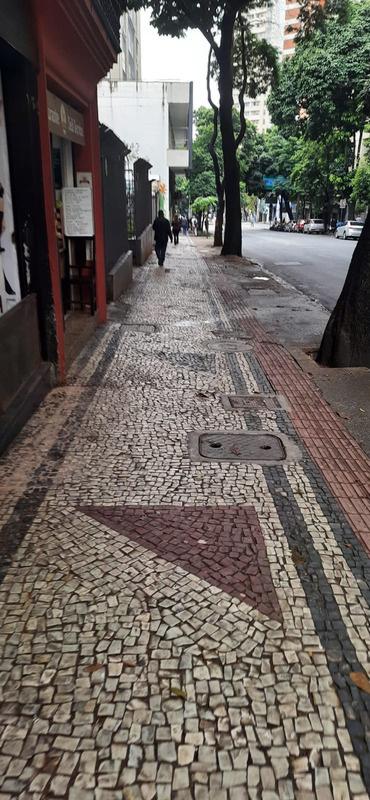 A calçada é composta de pedras portuguesas, como é o padrão da região central de Belo Horizonte, e encontra-se danificada, com buracos e relevos.