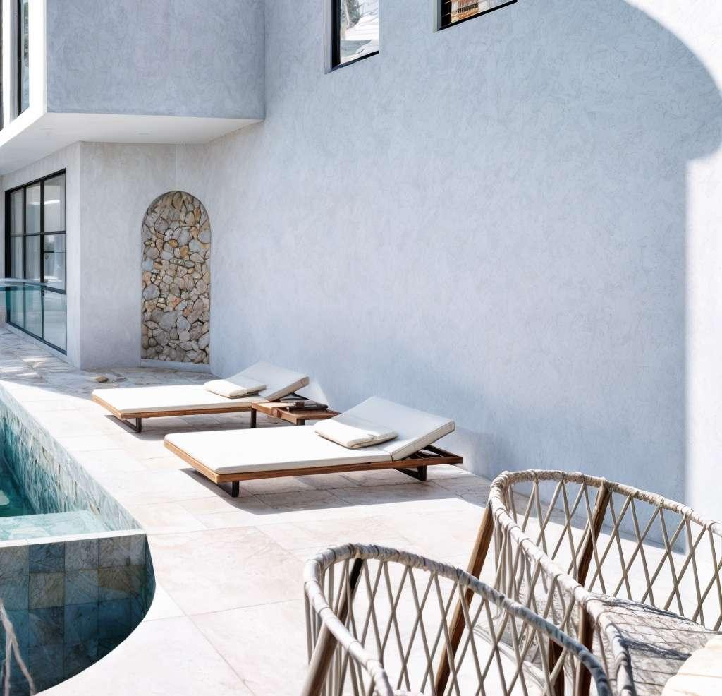 This double dwelling features a modern, curvilinear design that creates a sense of fluidity and harmony, integrating seamlessly with its surroundings. Each dwelling includes four spacious bedrooms, two living rooms, and large windows that allow natural light to fill the interiors. The layout fosters openness and flexibility for both formal and informal gatherings. A luxurious pool and landscaped outdoor area provide a tranquil space for relaxation.