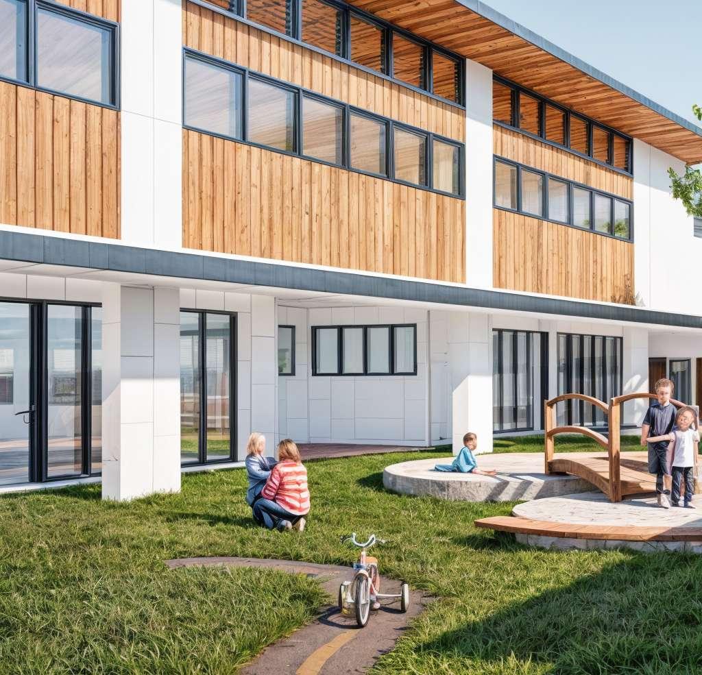 This childcare facility, designed for 110 children, combines functionality with aesthetic appeal, offering a safe and stimulating environment. It features four spacious playrooms, including a standout balcony area with timber battens and planter boxes that provide an acoustic barrier.