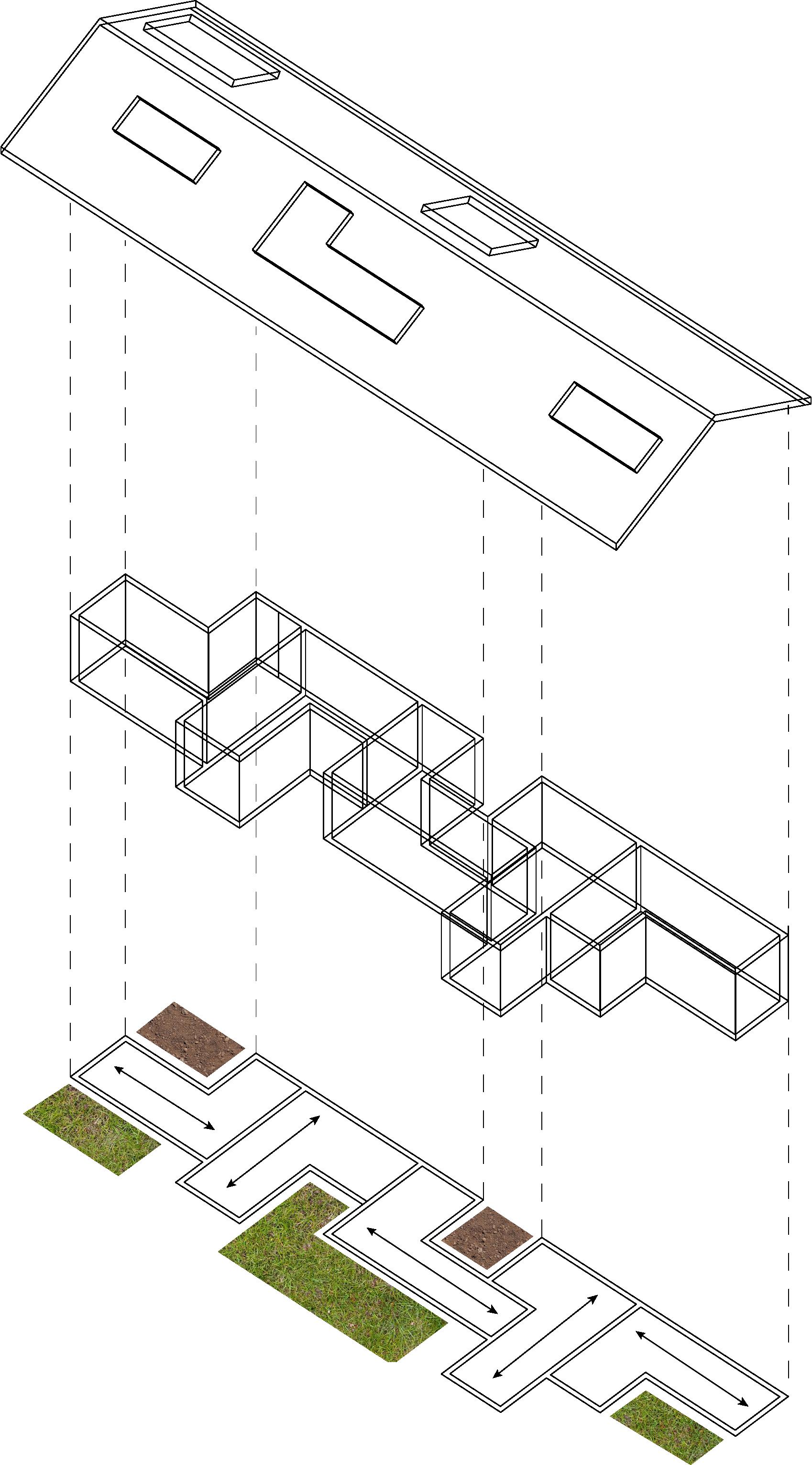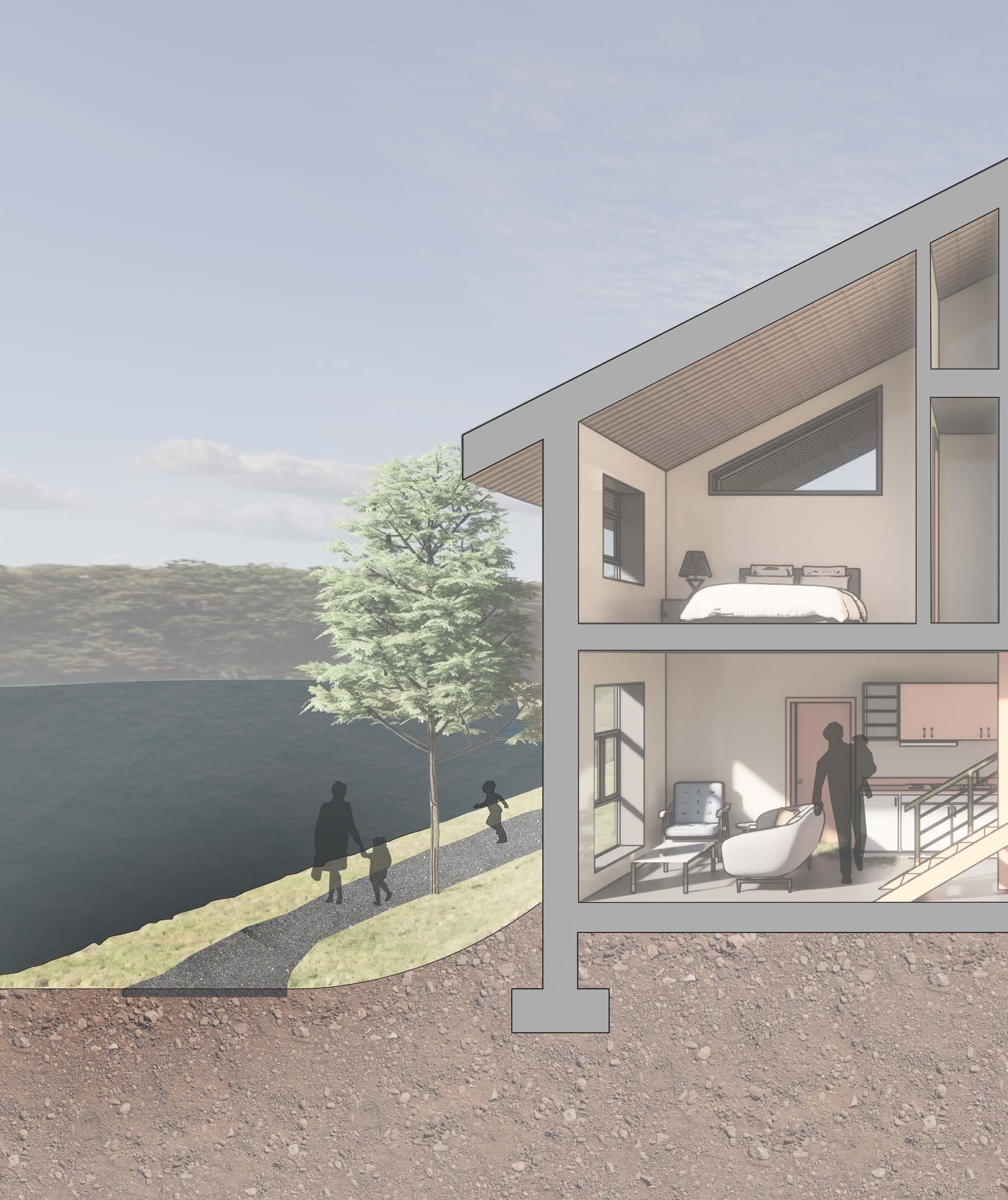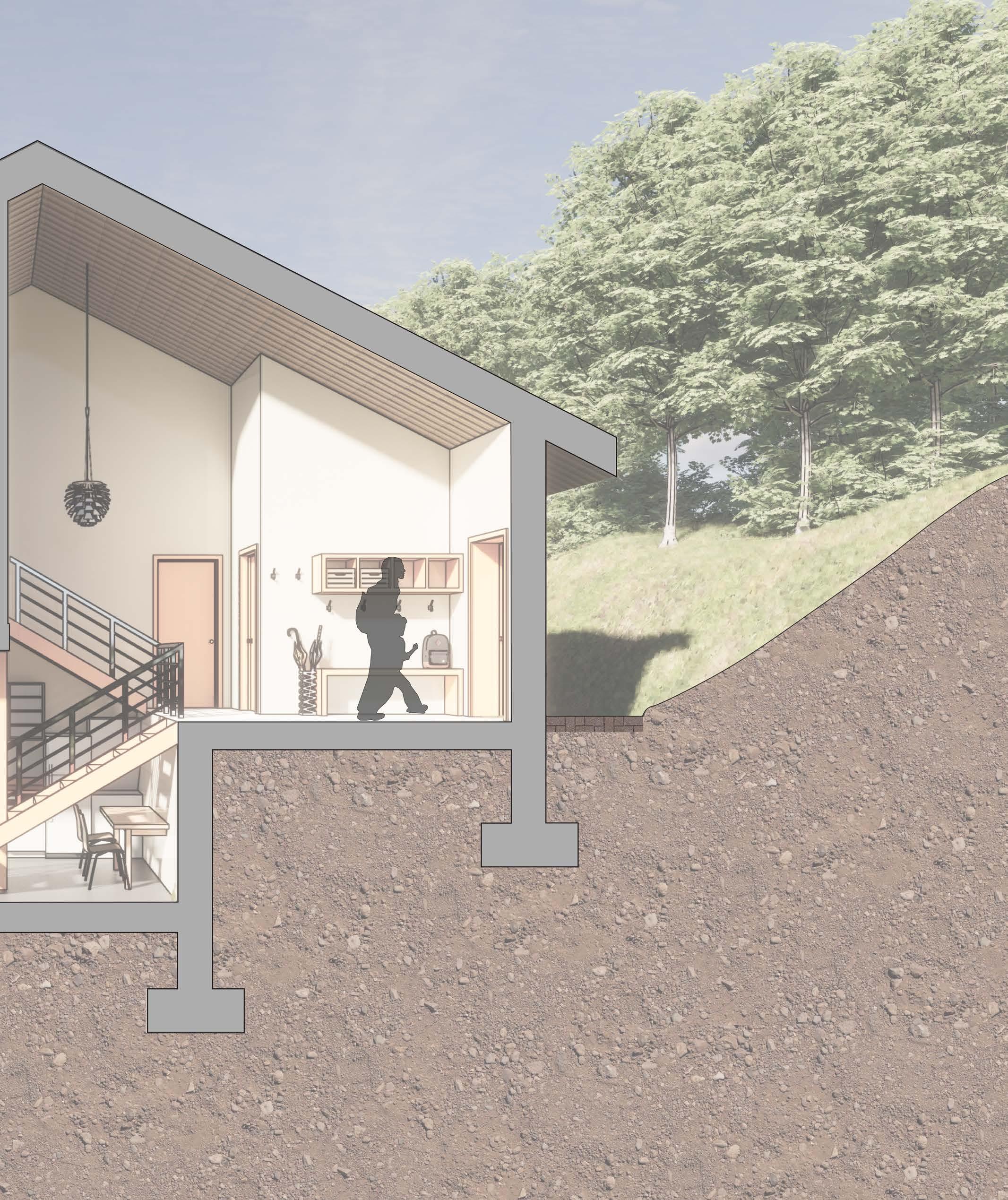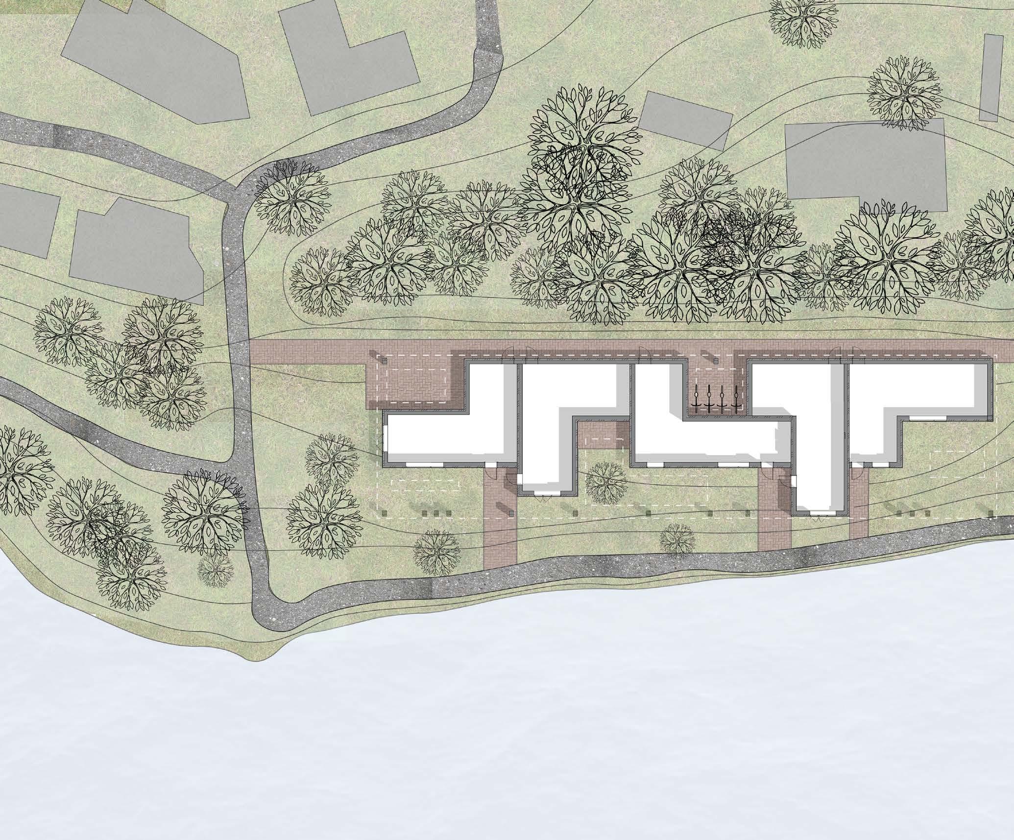 The L shaped units create spaces for outdoor recreation and storage. Cuts in the roof allow for varying levels of sunlight to reach the upper stories. The south side of the building boarders a path and is more public than the north side of the structure which is sunken into the hill.