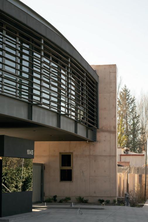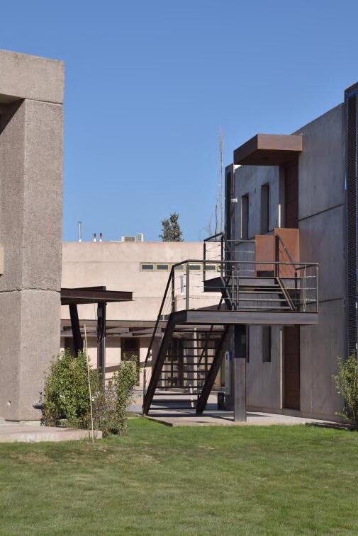 The focal point of entry is articulated through the entry building distinguished by its composition, two concrete blocks connected by a metal-framed bridge.