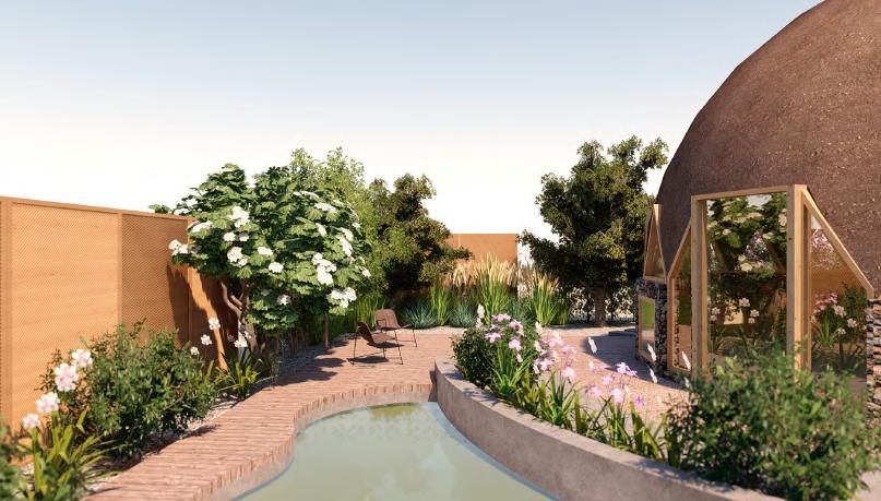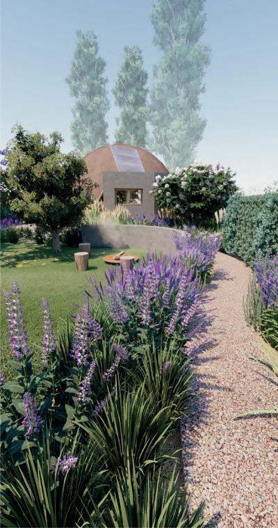 The overall design aims to establish connections between the dome house and the existing workshop, while crafting recreational spaces for the residents. The geometric pattern of the dome extends outward, forming gracefully winding flowerbeds. On the other hand, the grassy area provides a space for gatherings and yoga practices.