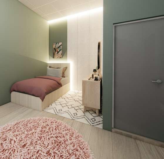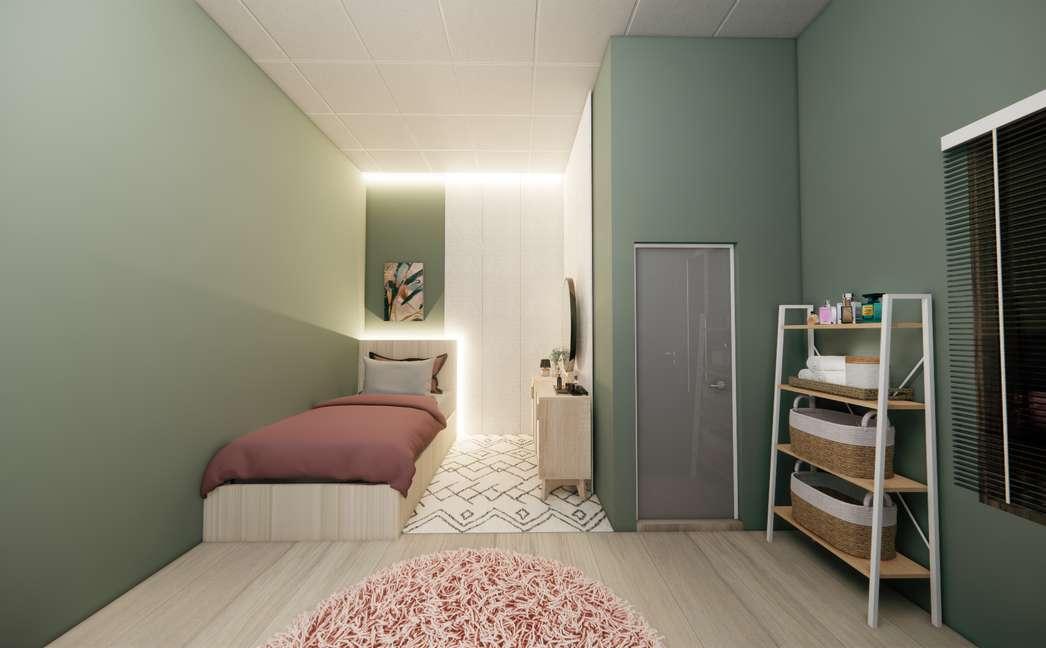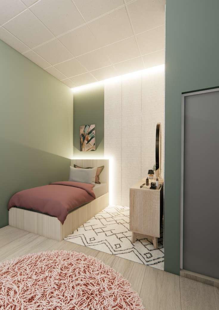 Perubahan Warna sangat terlihat di Pada Re-design Perubahan warna ini ingin memenuhi aspek Kenyamnan dan estetika pemilihan warna hijau memiliki kesan ruangan yang rindang dan sejuk sehingga menambah kenyamanan lalu diberi tambahan lapisan texture berbahan textile pada area tidur dan kabiner rias penambhanlapisaninijugasuatuusahauntukmengurangikebisingan