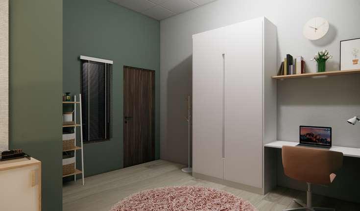 Meja Serbaguna diganti menjadi Kabinet , Kabinet ini dibutuhkan karna banyaknya barang yang ada di kamar sehinggga membutuhkan storage yang lebih besar dan dapat jugamemenuhi aspek estetika sehingga barang pun tersimpan dengan rapi dan diatas kabinet dimanfaatkan sebagai area rias dan dilengkapi cermin diatasnya